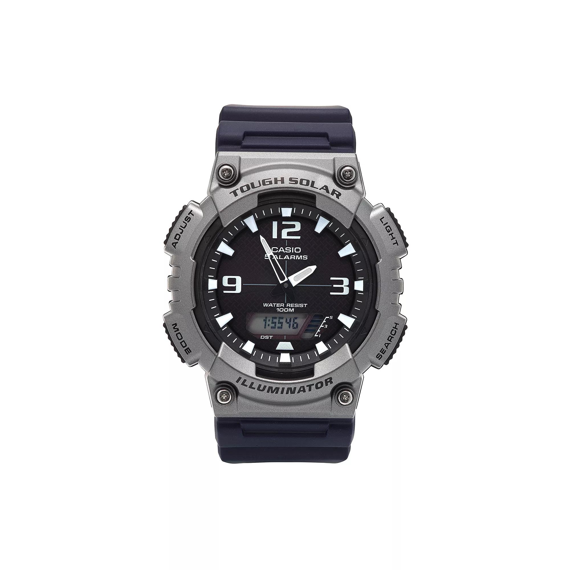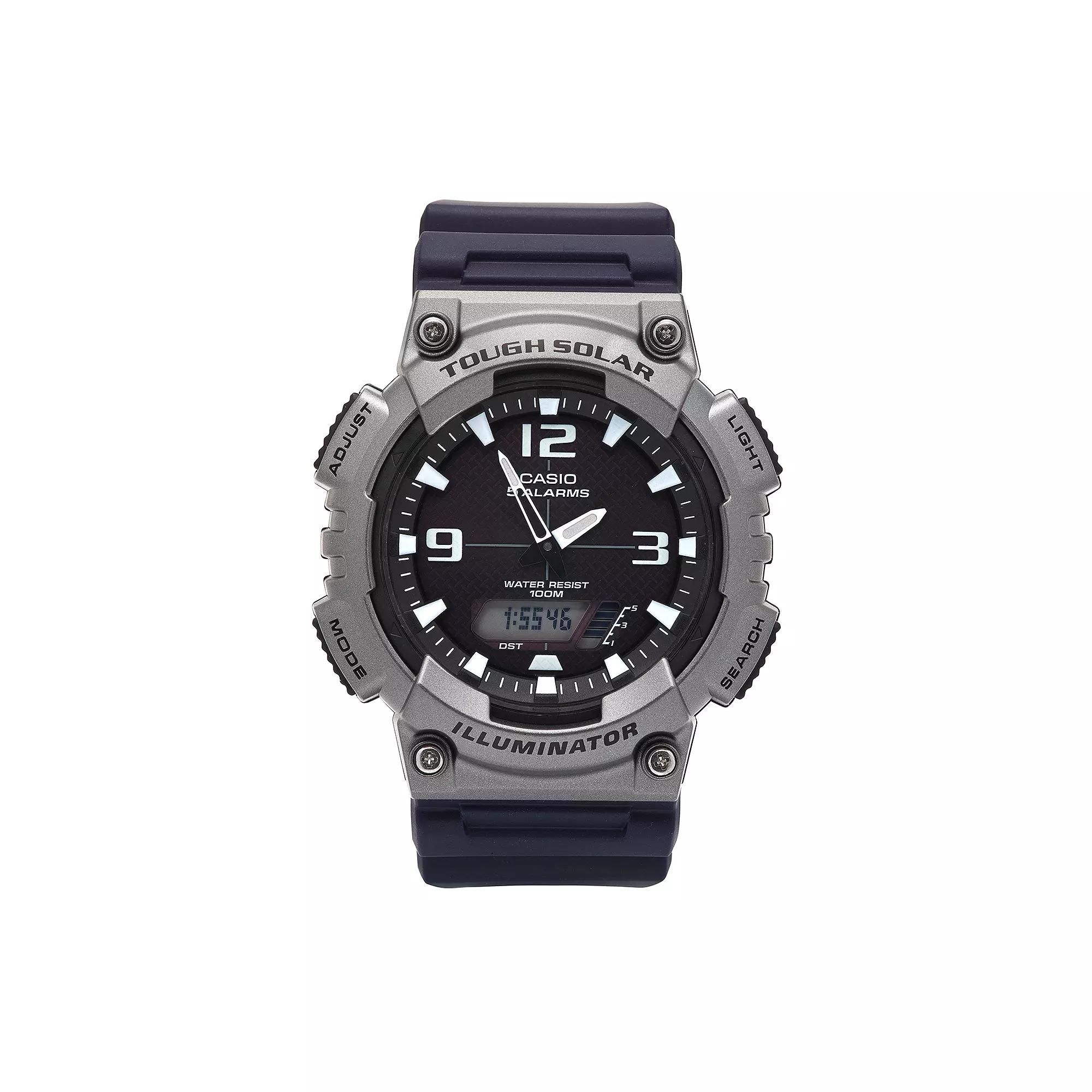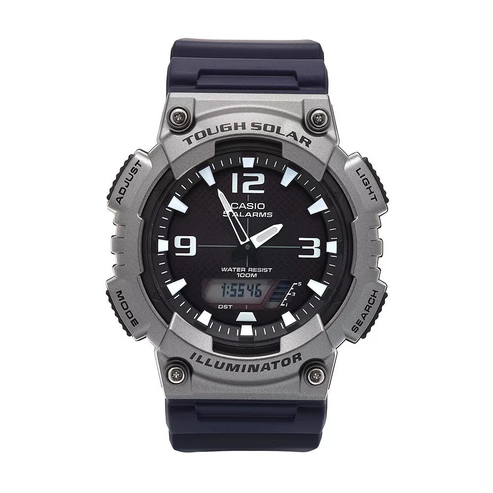 You'll never be late again with this men's solar-powered Casio watch and its five daily alarms, world timekeeping function, dual countdown timers and more.FEATURESCalendar: day & date5 daily alarms12/24-hour formatsWorld time: 31 time zones (48 cities & GMT)Daylight saving on/off indicatorDual countdown timers for interval trainingDISPLAYDial color: blackIllumination Super Illuminator LED backlight with afterglowLuminescence: hands & hour markersFace cover material: acrylicCASEMaterial: gray & black resin with stainless steel screw-down backDiameter: 52 mmBANDMaterial: black resinClasp: buckleCircumference: adjusts from 140 mm to 228 mmWidth: 22 mmDETAILSMovement: quartzPower: Tough SolarWater resistance: 100 metersPackaging: boxedWarranty: manufacturer's 1-year limitedFor warranty information please click hereModel number: AQS810W-1A4VCF Size: Large. Gender: male. Age Group: adult.