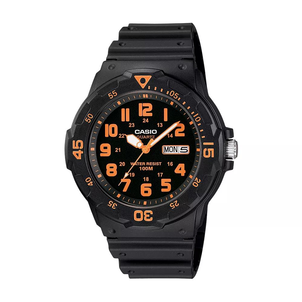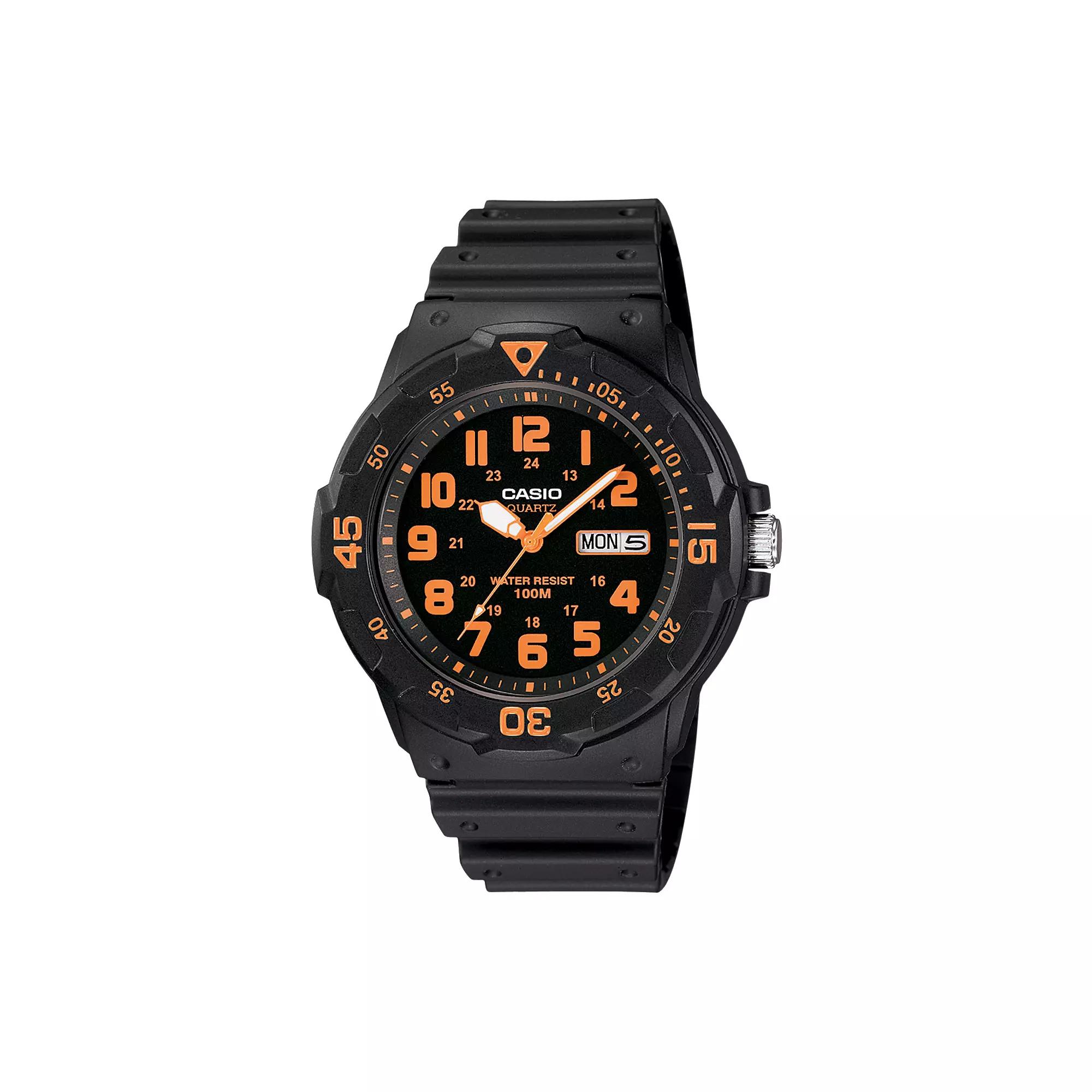 A sleek, black resin construction makes this mens watch the perfect timepiece to complete your stylish look.Product Overview: Dial: black with luminous hands & green Arabic numerals Water resistance: 100 meters Movement: quartz Power type: battery Manufacturers 1-year limited warrantyFor warranty information please click here Special Features: Calendar: day & date Bezel: bidirectional 12/24-hour formats Construction: Case: black resin Caseback: stainless steel Band: black resin (adjustable) Dimensions: Case size: 45-mm diameter Band length: 230 mm Size: One Size. Gender: male. Age Group: adult. Material: Rubber/Silicone.