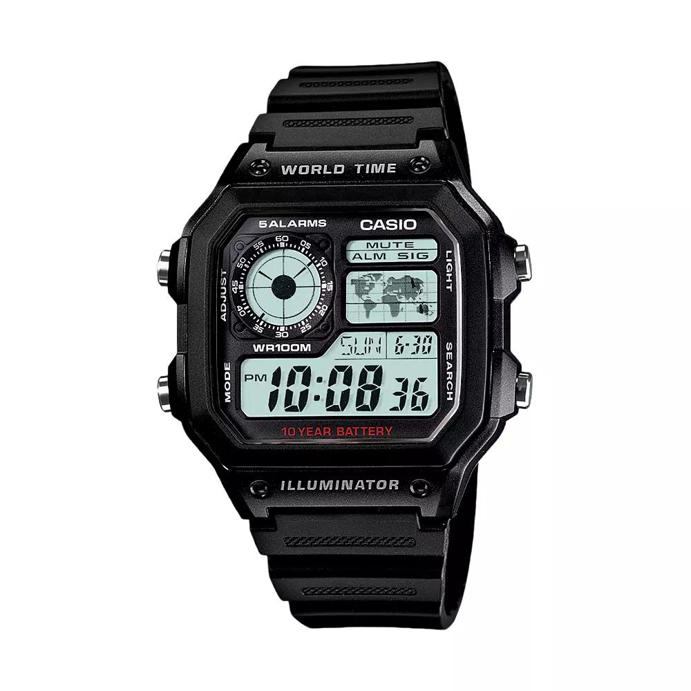 Featuring world time in 48 cities, an automatic calendar and digital chronograph functionality, this men's watch is a must-have for the avid traveler.Product Overview: Dial: digital display with LED backlight & afterglow Water resistance: 100 meters Power type: battery Manufacturer's 1-year limited warrantyFor warranty information please click here Model no. AE1200WH-1AV Special Features: Automatic calendar: Day & date Pre-programmed to the year 2099 5 daily alarms Hourly chime 12/24-hour formats World Time: 31 time zones (48 cities) Greenwich Mean Time display Chronograph: Elapsed & split time 1/100-second for up to 24 hours 24-hour countdown timer Construction: Case: black resin Caseback: stainless steel Band: black resin (adjustable) Dimensions: Case size: 42-mm H x 45-mm W Size: One Size. Gender: male. Age Group: adult. Material: Rubber/Silicone.