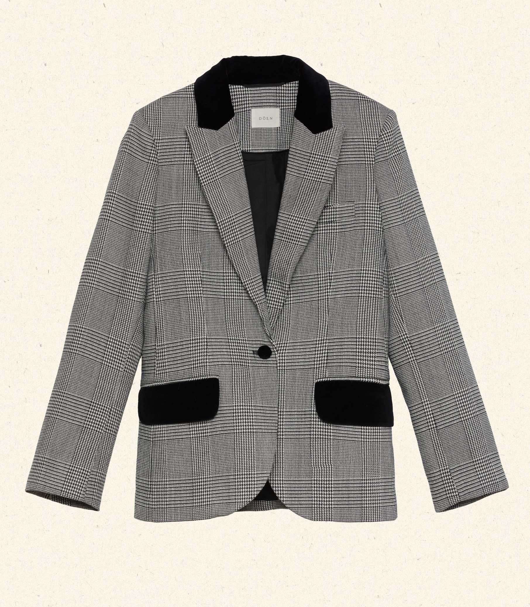 Inspired by ‘60s equestrian wear, the DÔEN Heirloom Casper Blazer—in a classic houndstooth check Italian wool blend—features a cutaway silhouette, velvet detailing at the collar and pocket flaps, and a single velvet covered button.