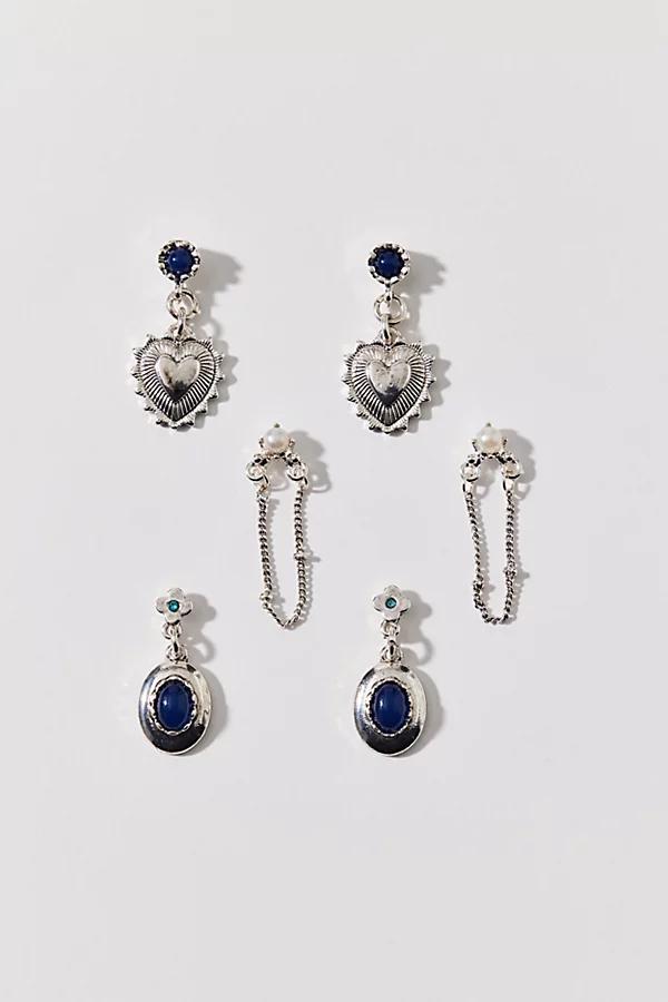 Set of three pairs of coordinated earrings all with an ornate vintage-inspired look complete with gem and pearl bead detailing. Finished with post backings. Features Cass gem heart locket earring set Set of statement earrings Three pairs of ornate earrings Locket inspired with gem and pearl details In antiqued gold or silver finish Post backing Content + Care Set of 3 pairs Mixed metal, glass Avoid contact with water Imported Cass Gem Heart Locket Earring Set in Silver, Womens at Urban Outfitters