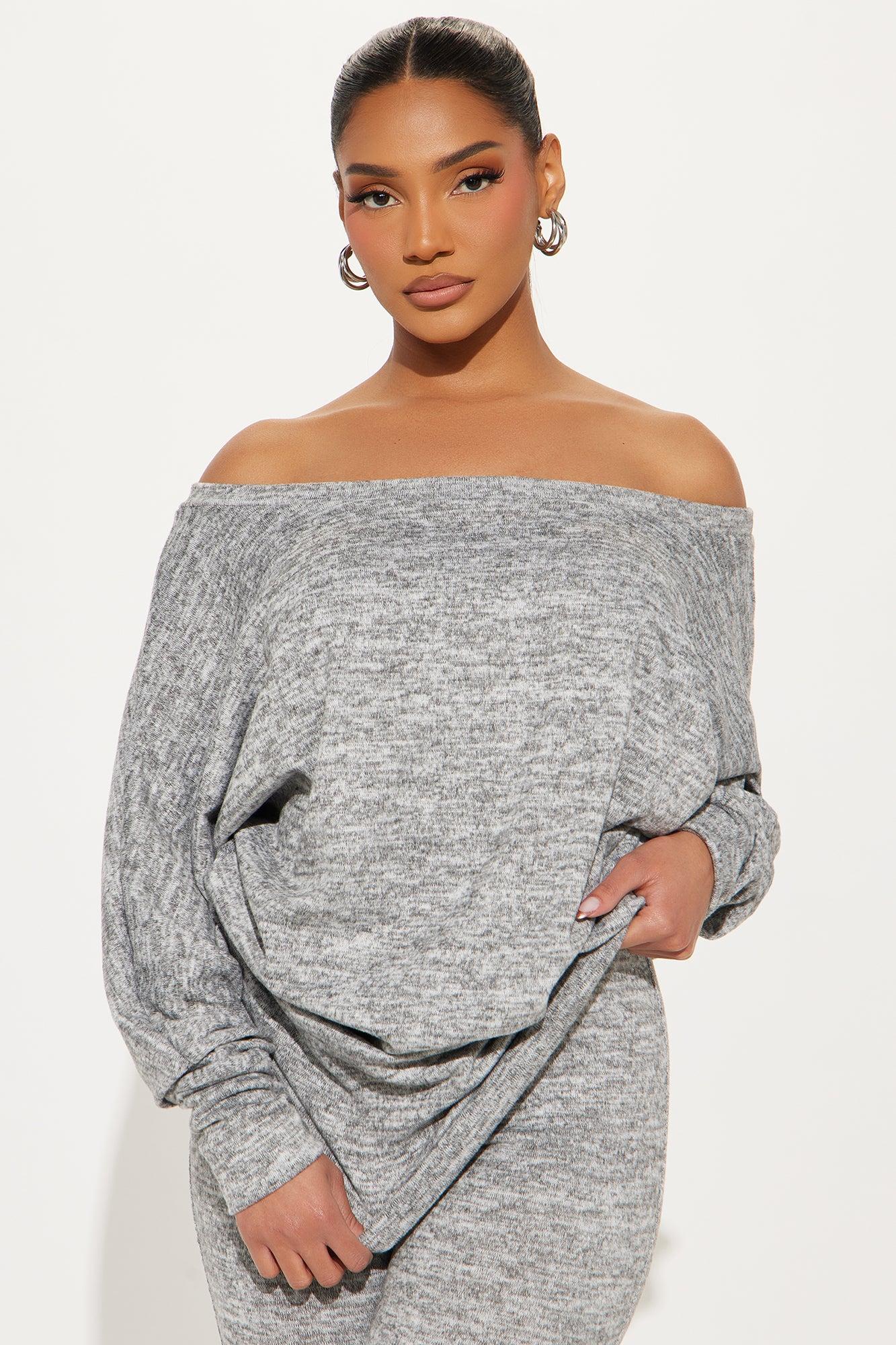 Available In Burgundy, Grey And Mocha. Legging Set Stretch Off Shoulder Top Ruched Detail Leggings Elastic Waistband 82% Rayon 13% Polyester 5% Spandex Imported