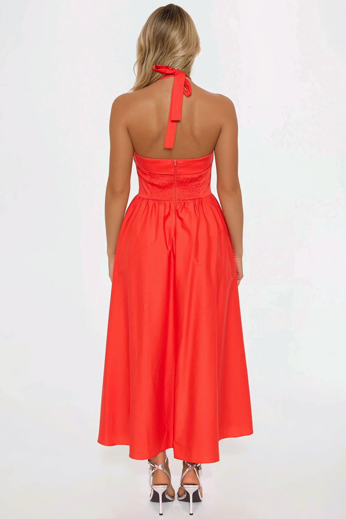 Available In Orange And White. Lace Up Midi Dress Square neckline Halter Lace up Faux corset waist Smocked back Back zipper Stretch Lined Length measured flat = 48" Self: 70% Cotton 27% Nylon 3% Spandex Lining: 100% Polyester Imported