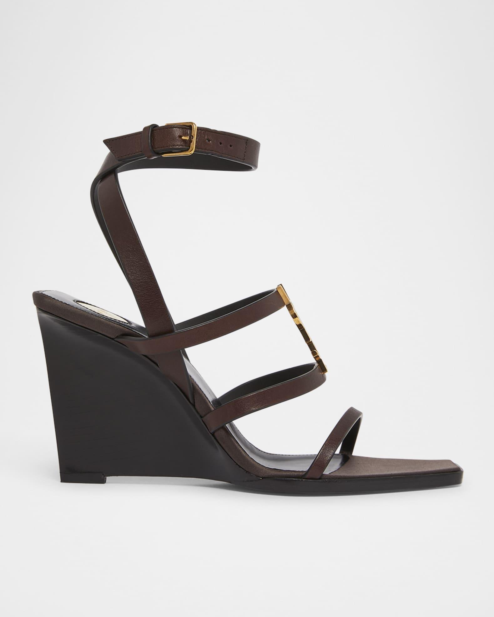 Saint Laurent "Cassandra" calf leather sandals. 3.50 in / 90 mm wedge heel. Open toe. Three-band upper with YSL medallion. Adjustable ankle strap. Leather outsole. Made in Italy.