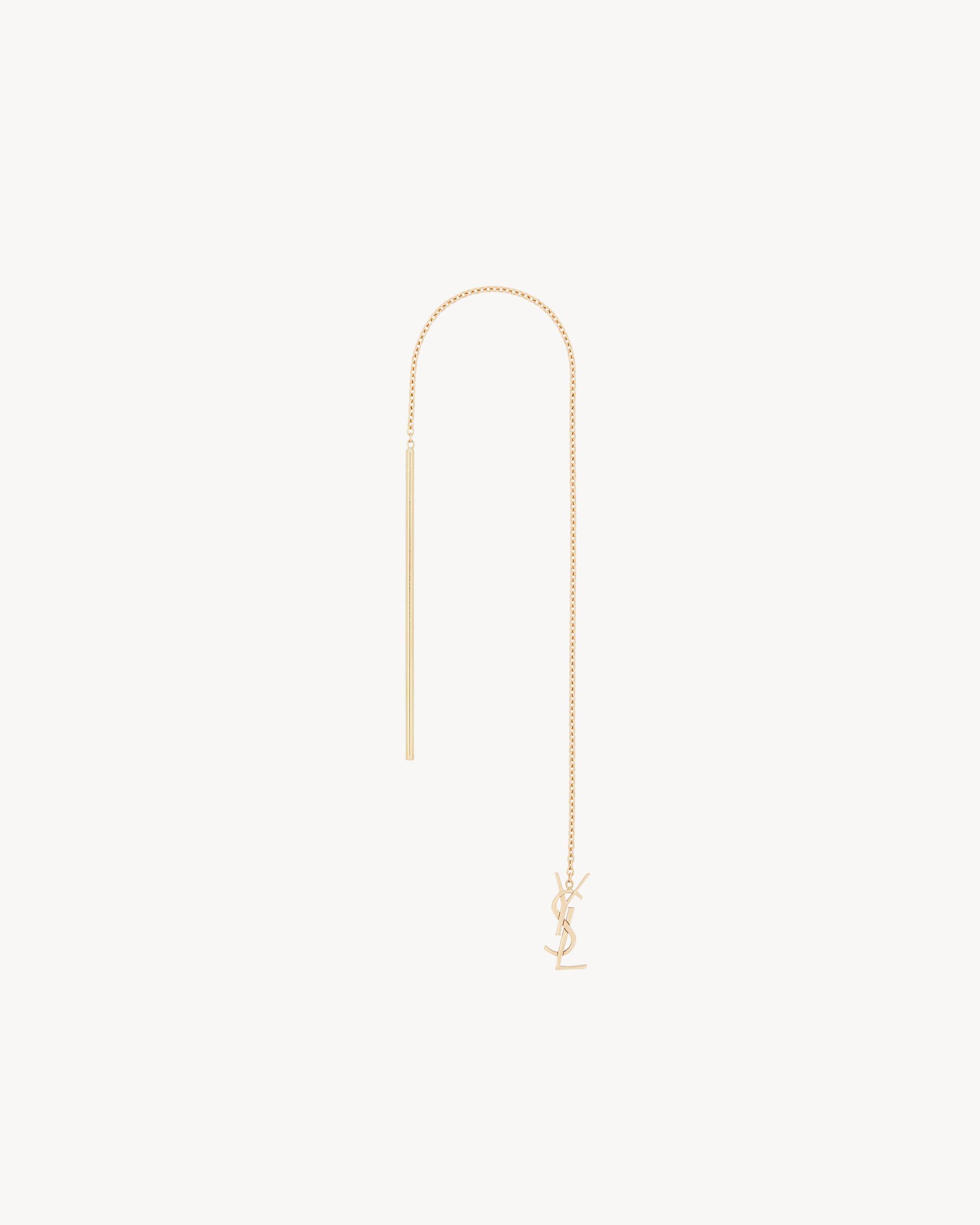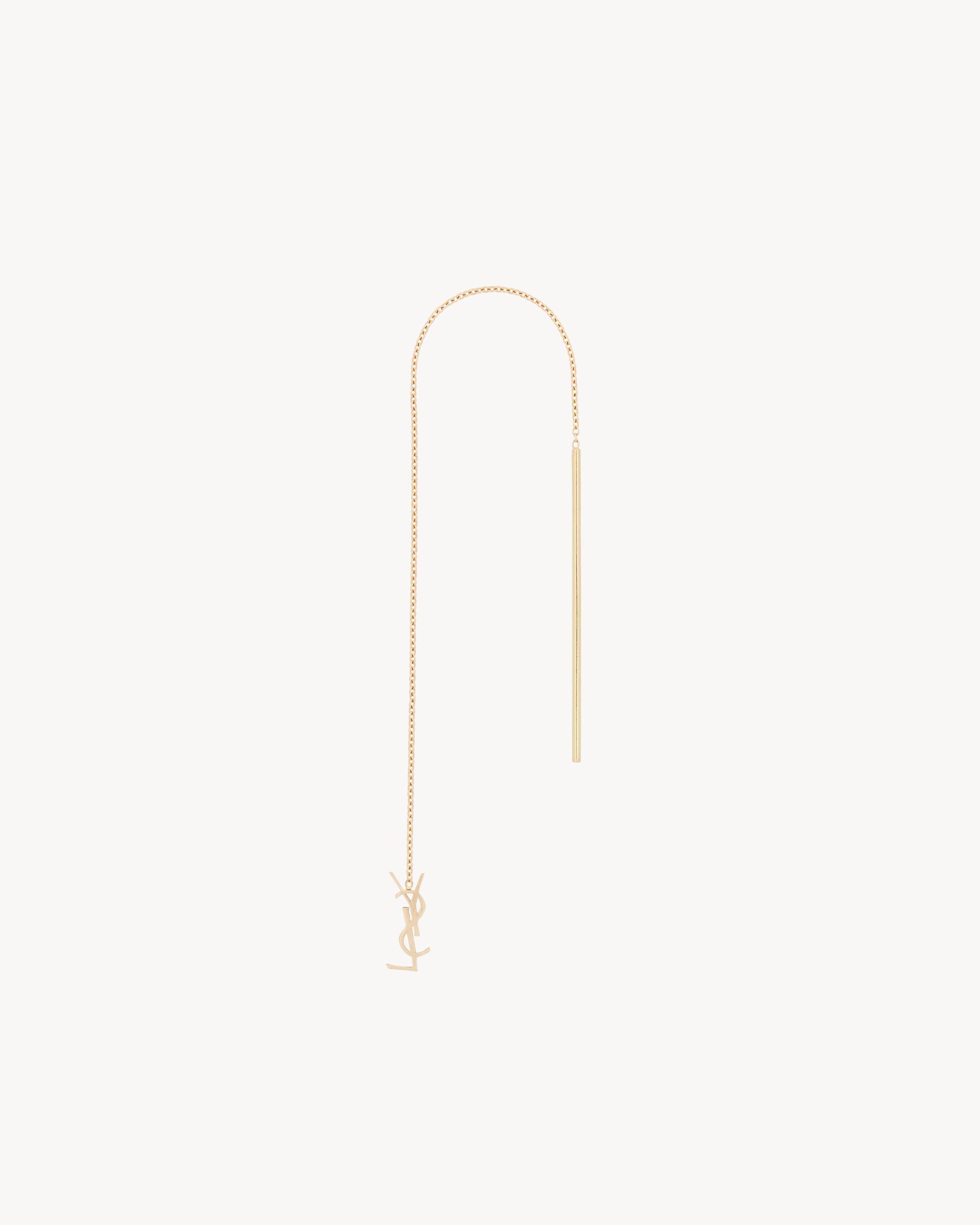 long threader single earring made with recycled gold, featuring a fine chain and CASSANDRE pendant.GOLD IS A PRECIOUS MATERIAL THAT IS MALLEABLE AND HIGHLY SENSITIVE TO SCRATCHING. THE PRODUCT IS EXPECTED TO EVOLVE AND PRESENT MARKS THROUGHOUT ITS LIFECYCLE. MOREOVER, AS GOLD IS A SOFT ALLOY, PIECES SHOULD NOT BE STACKED ONE ON TOP OF THE OTHER TO AVOID DAMAGING THEM. EVERY PIECE OF JEWELRY MUST BE STORED IN ITS ORIGINAL PACKAGING TO AVOID ANY FRICTION WITH OTHER OBJECTS THAT COULD SCRATCH IT. WHEN PART OF A SET, PIECES MUST BE STOCKED SEPARATELY.