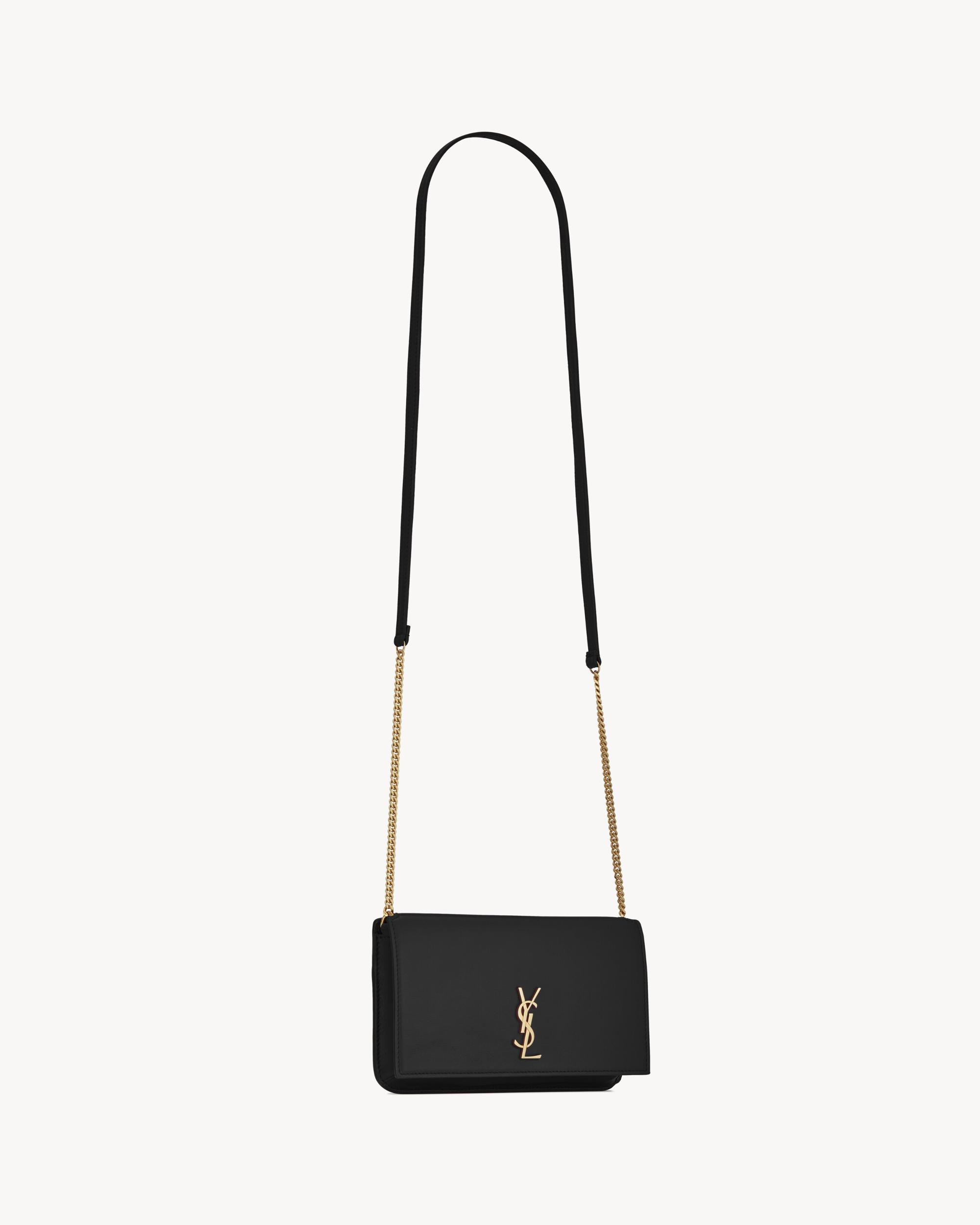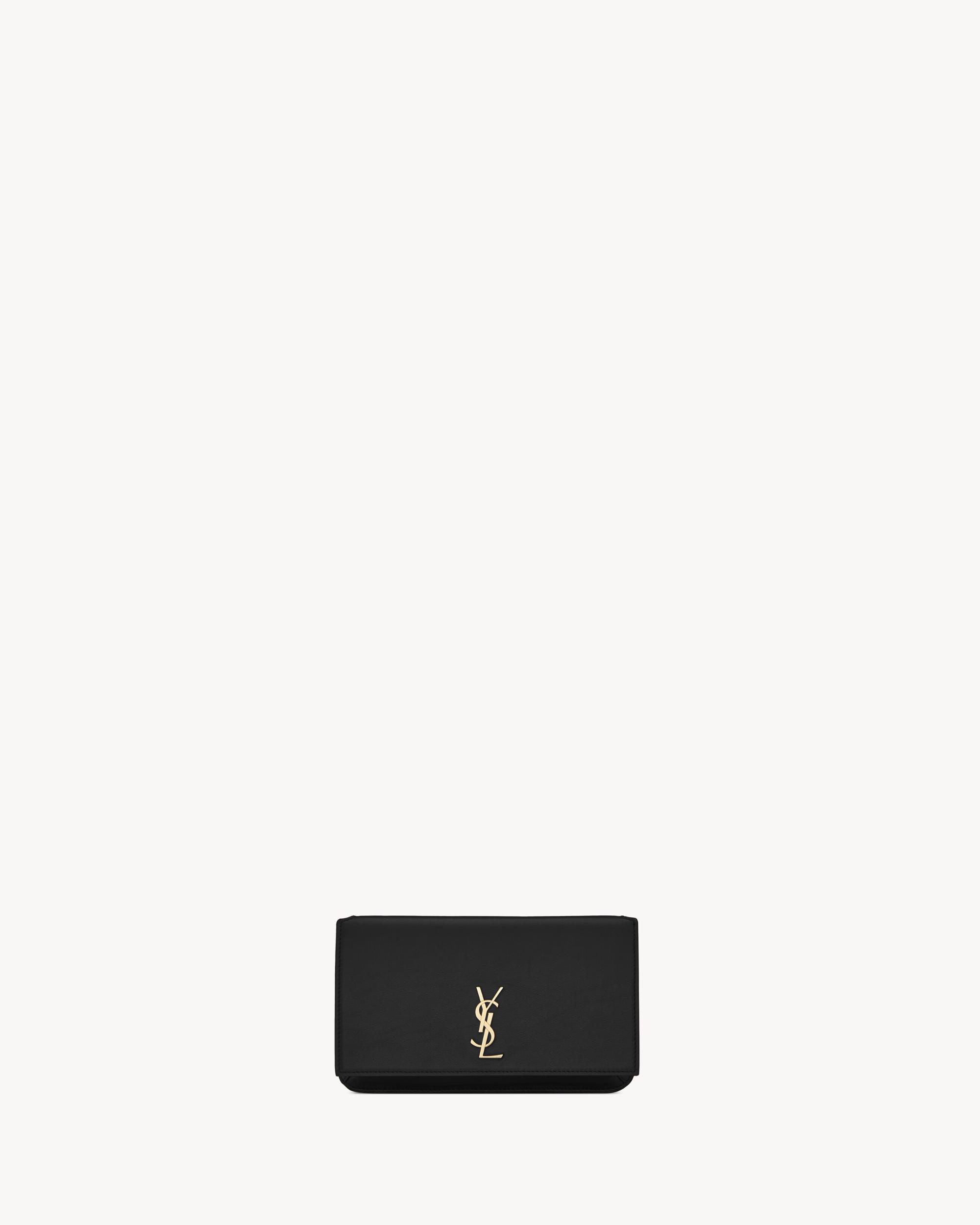 Cell phone holder with front flap decorated WITH THE CASSANDRE, featuring a leather and chain shoulder strap.