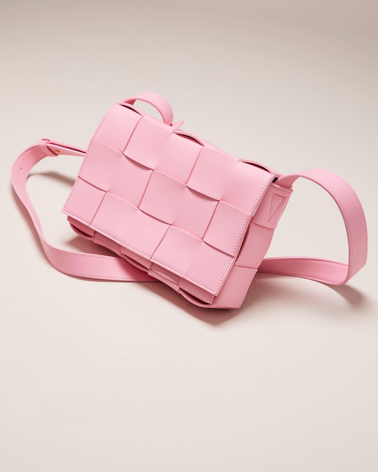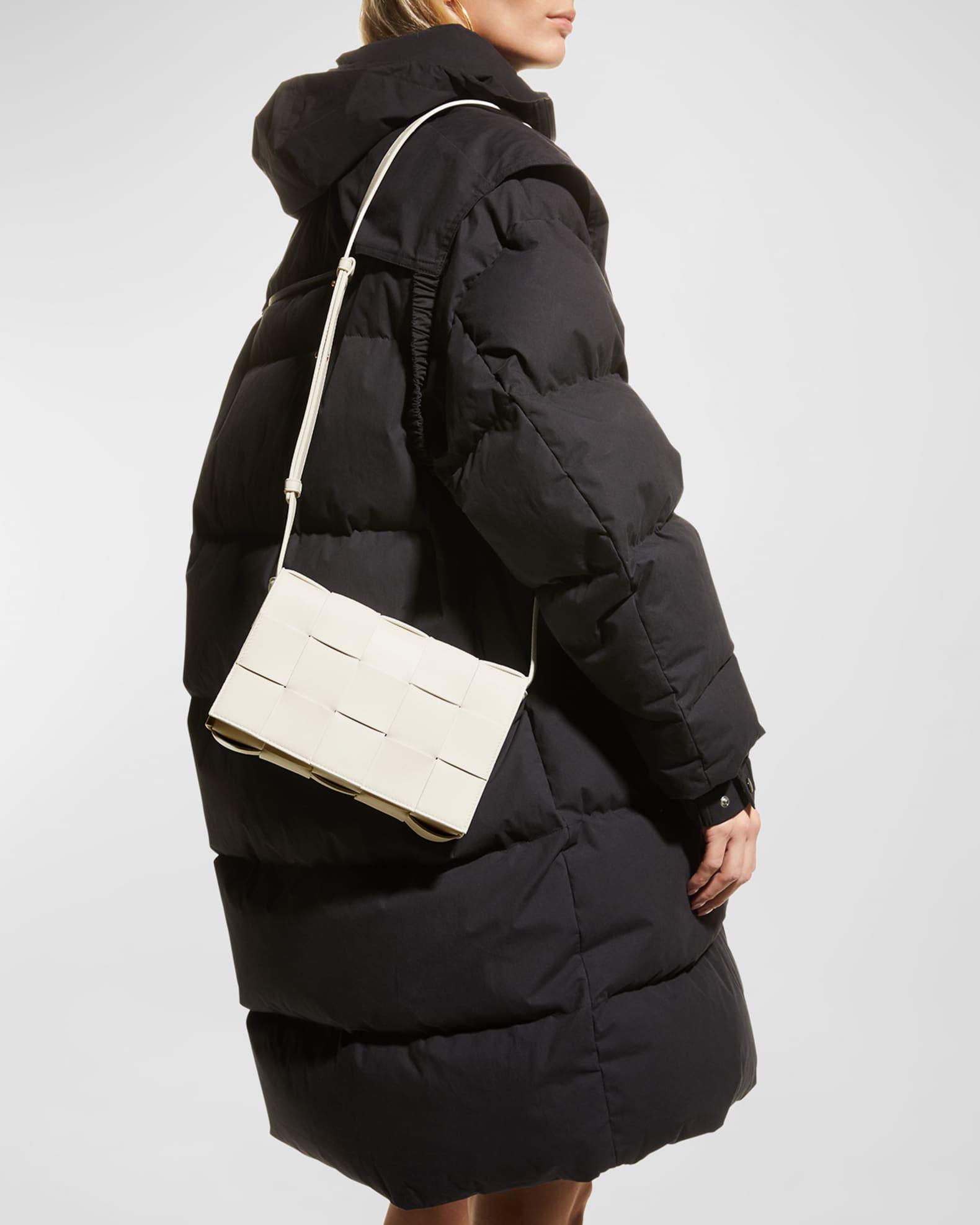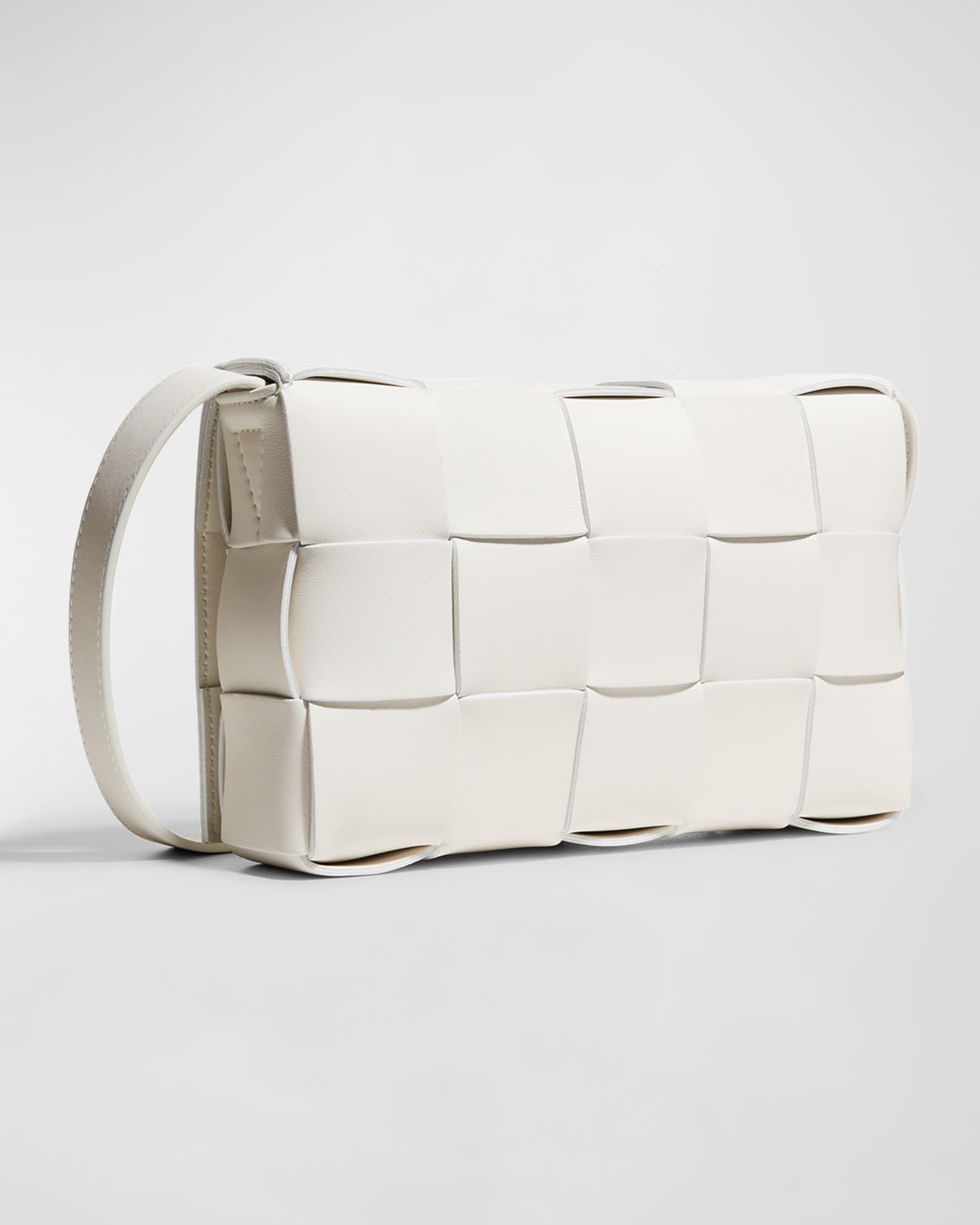 Bottega Veneta crossbody bag in large-scale intrecciato woven napa leather. can be worn over the shoulder or across the body. Adjustable shoulder strap; 55cm / 21.7" drop Flap top with magnetic closure. Single interior zipped pocket 5.9"H x 9.1"W x 2.2"D. Item weighs approx. 1.71 lb. Made in Italy.