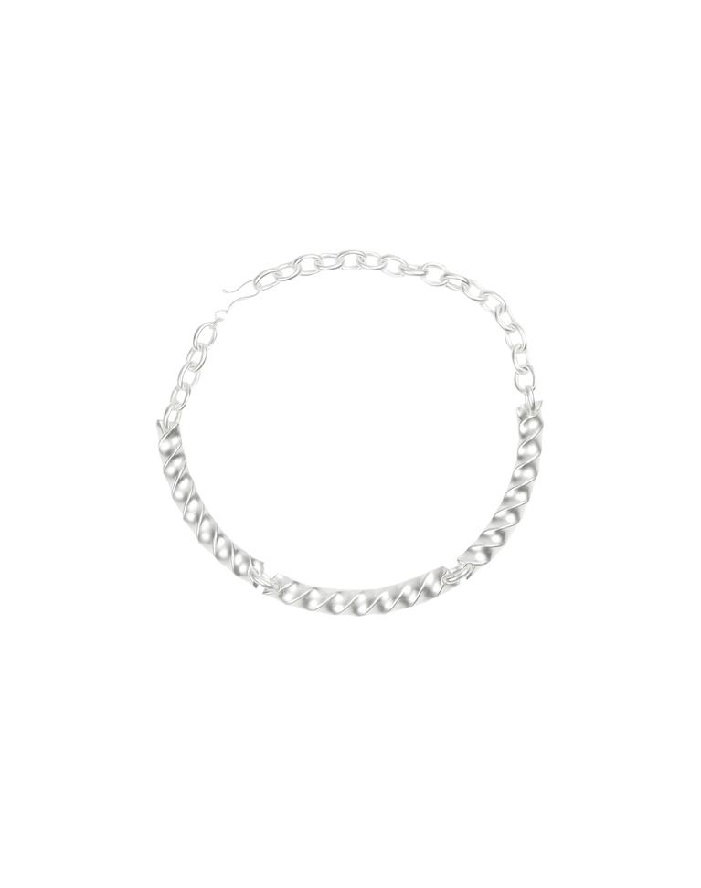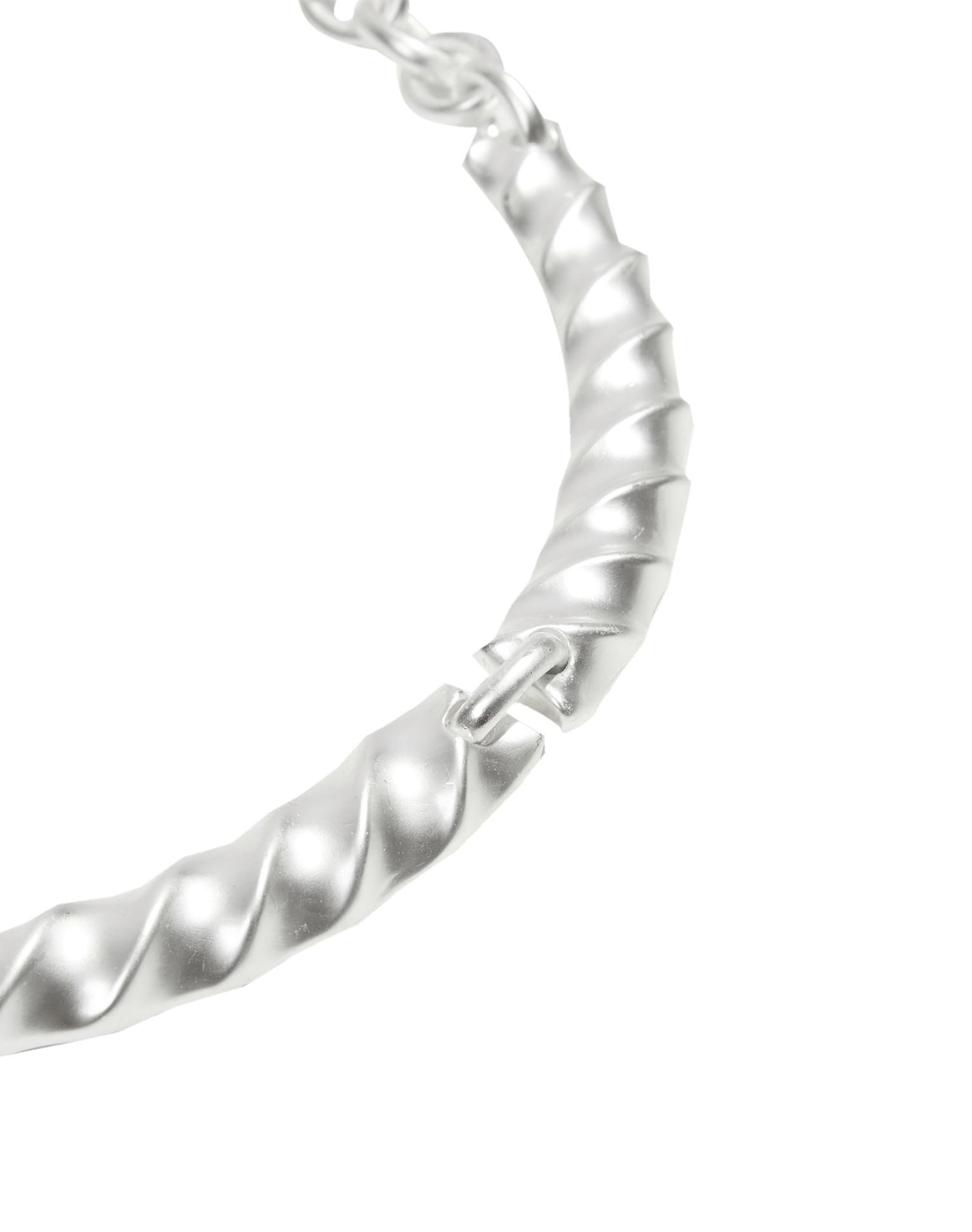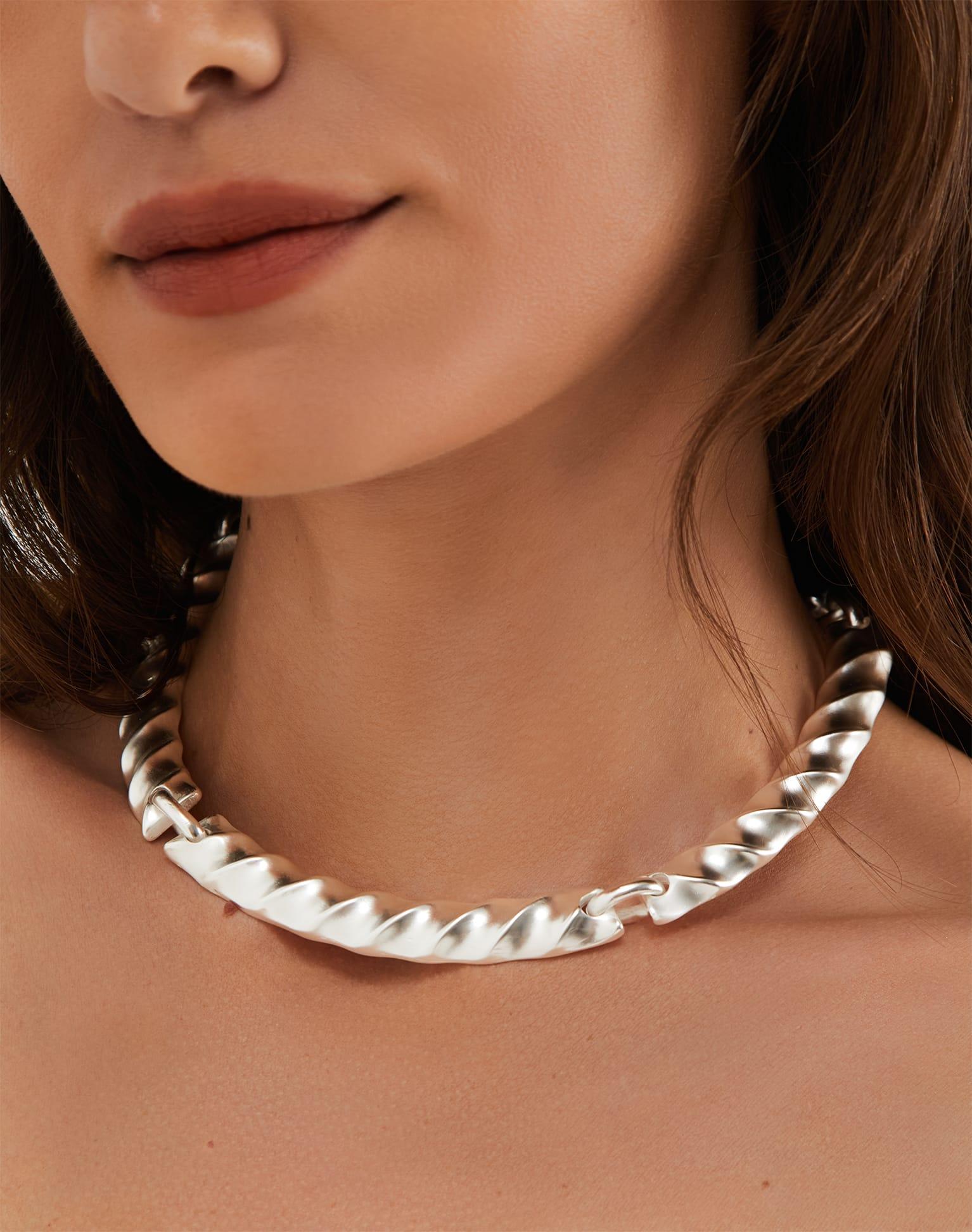 The ViX Cassi Choker offers a modern, refined take on the classic choker. Crafted from sleek silver metal, it features multiple interlinked sections with an elegant twisted design, creating fluidity, texture, and dimension for a striking finish. Style the Cassi Choker with other ViX accessories for a stunning ensemble.