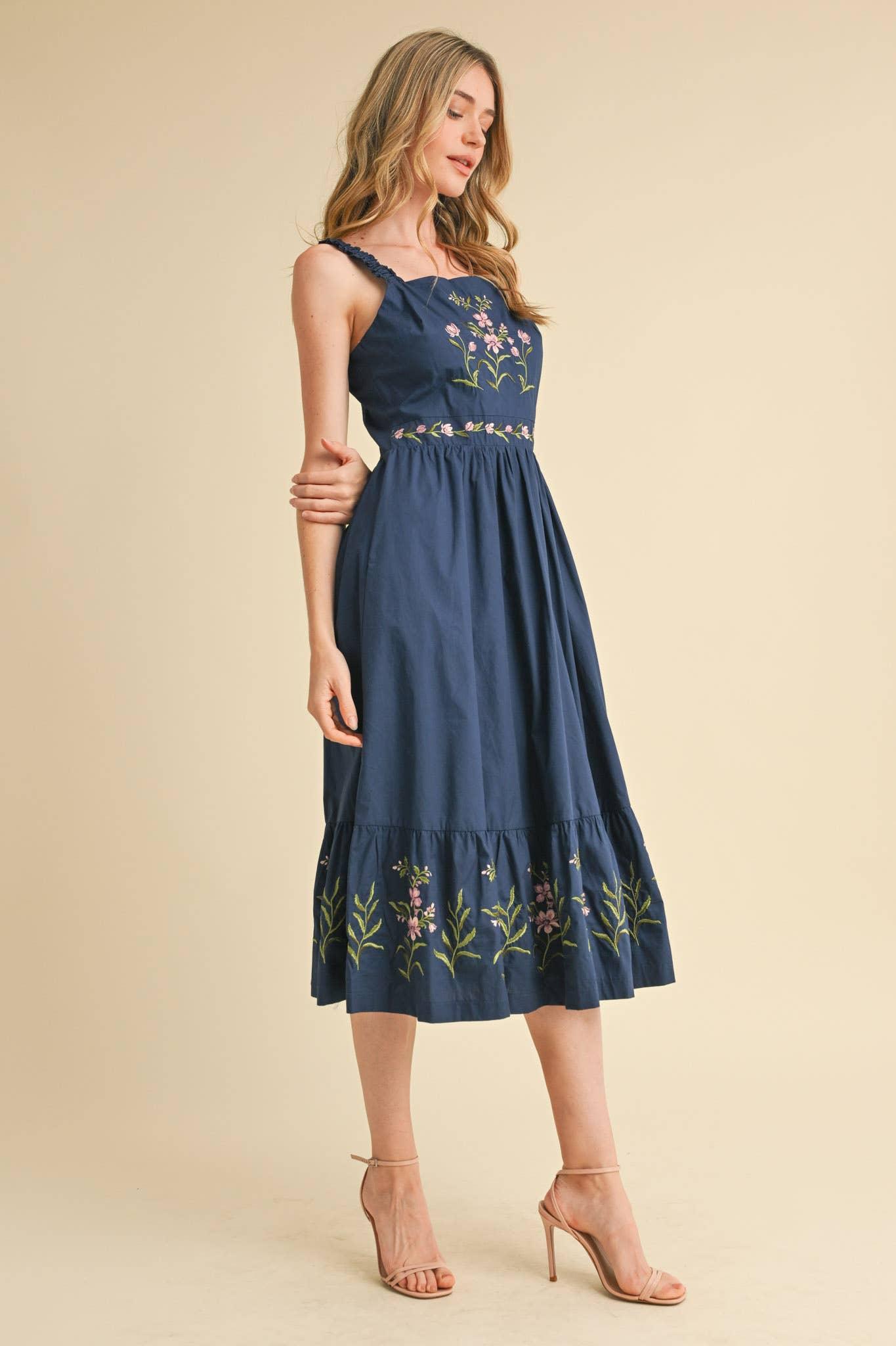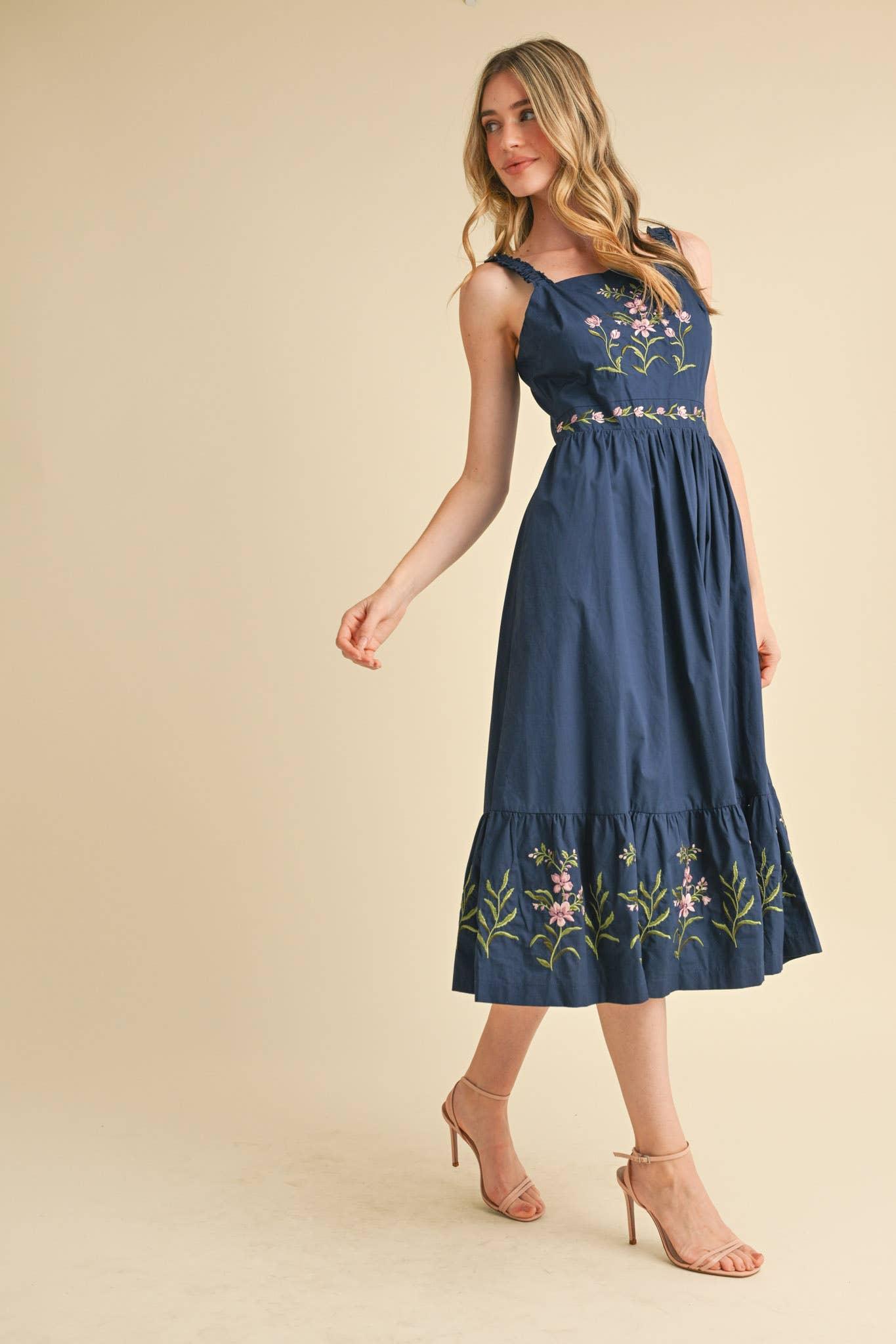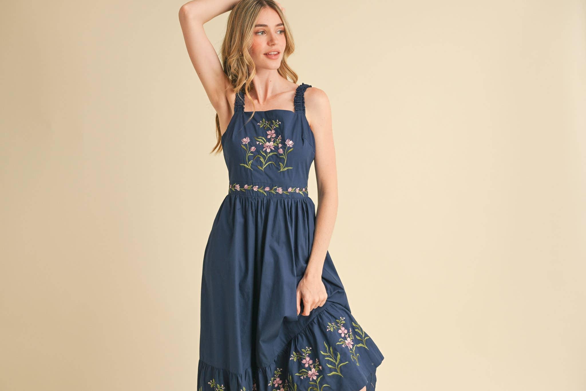 Arrive on the scene like a beauty in this floral embroidered midi dress! Woven fabric boasts a vibrant design of embroidered flowers as it shapes a square neckline, wide elastic straps, and a fitted bodice. High, fitted waist sits atop a twirly midi skirt with pockets and finishes with floral embroidery on the long ruffle hem. Smocked elastic on the back with hidden back zipper.