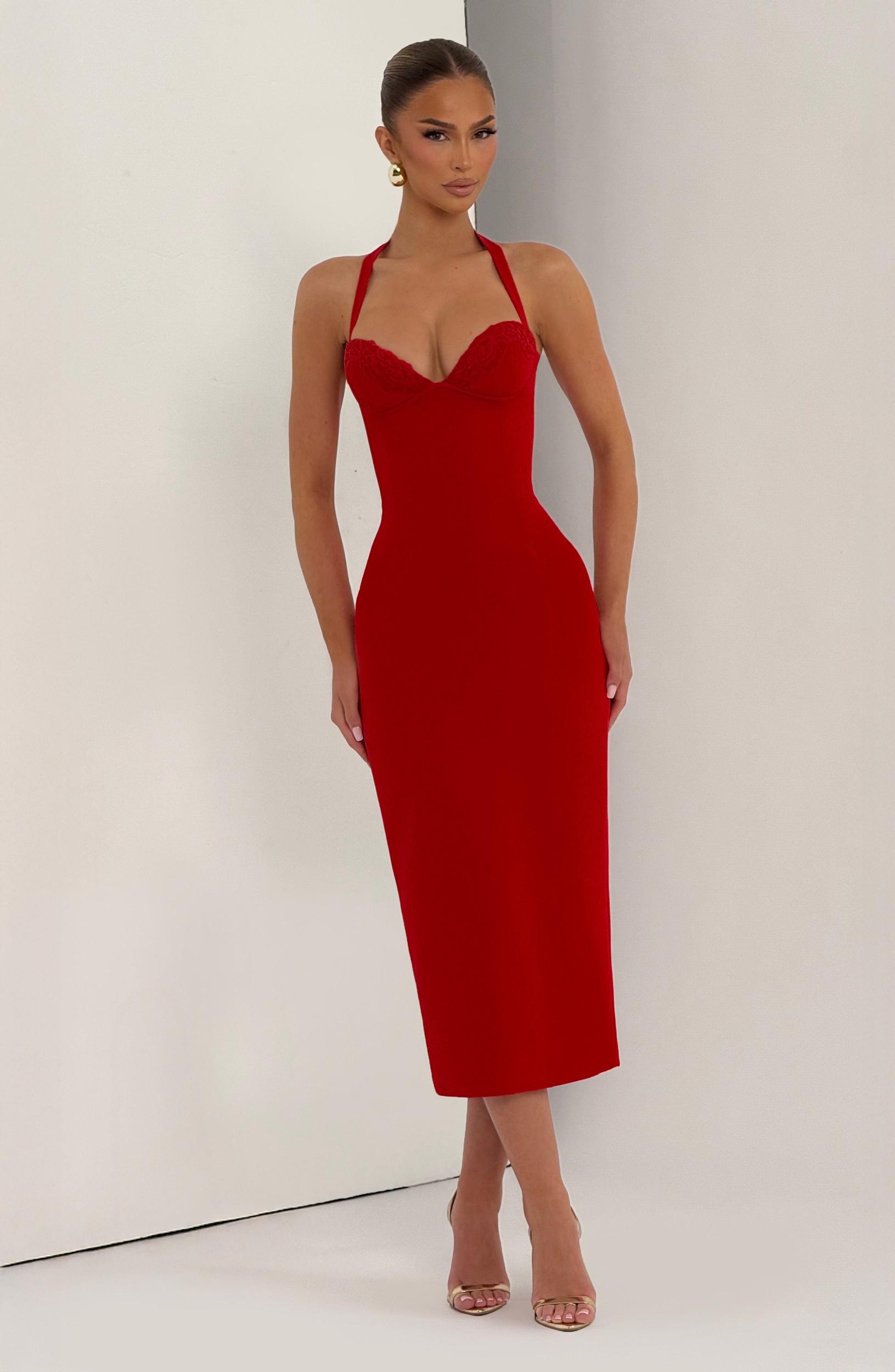 The Cassia Midi Dress in red is crafted from non-stretch crepe, this figure-hugging silhouette features a lightly padded, underwired bodice with delicate lace trim detailing. Halterneck straps provide secure support, while the midi-length pencil skirt creates a polished, elongated line. Colour: Red. Non-stretch crepe. Fully lined. Midi length. Lightly padded cup, underwired cups. Lace trim on cups. Halter neck ties. Pencil skirt. Lace up back. Centre back split.