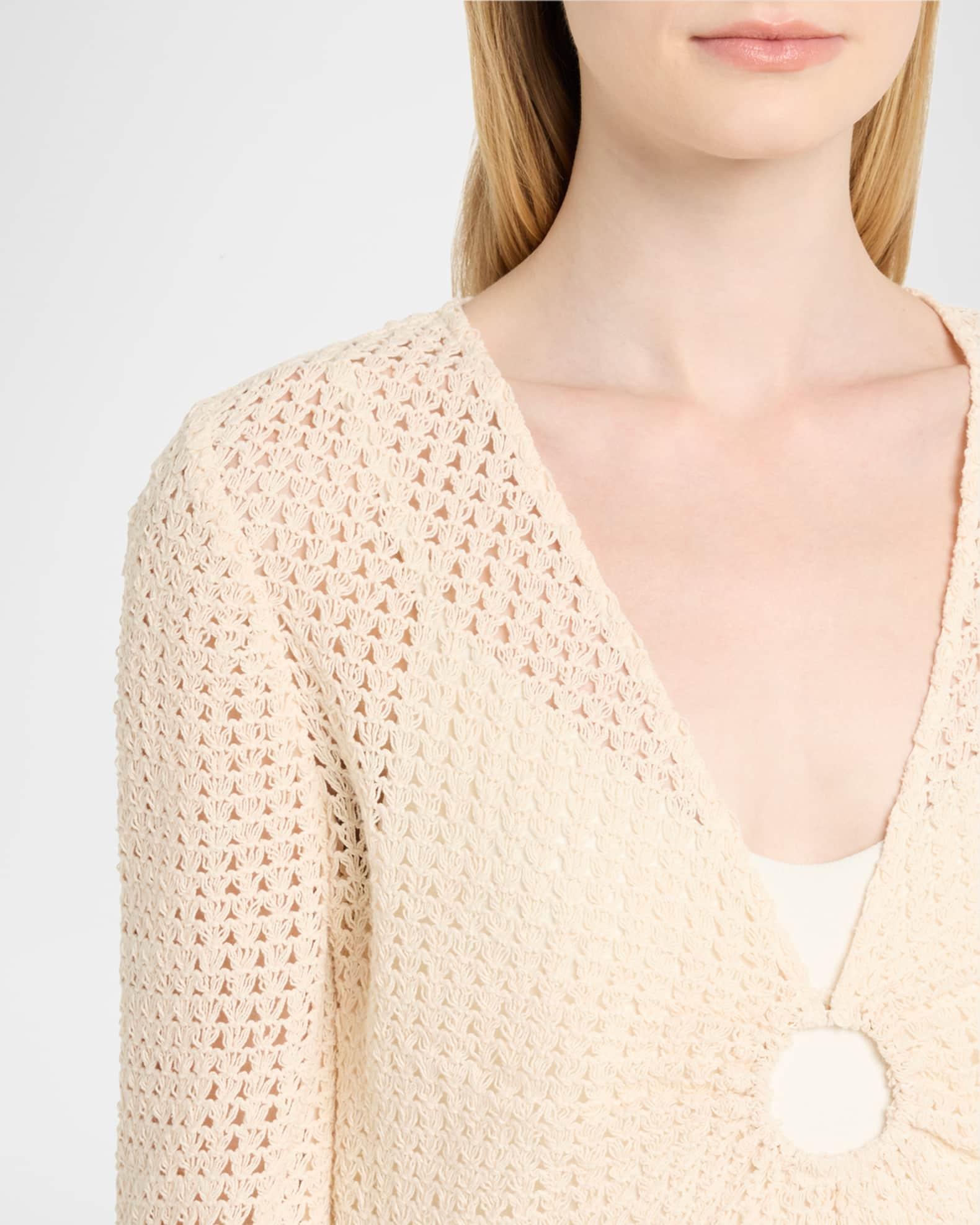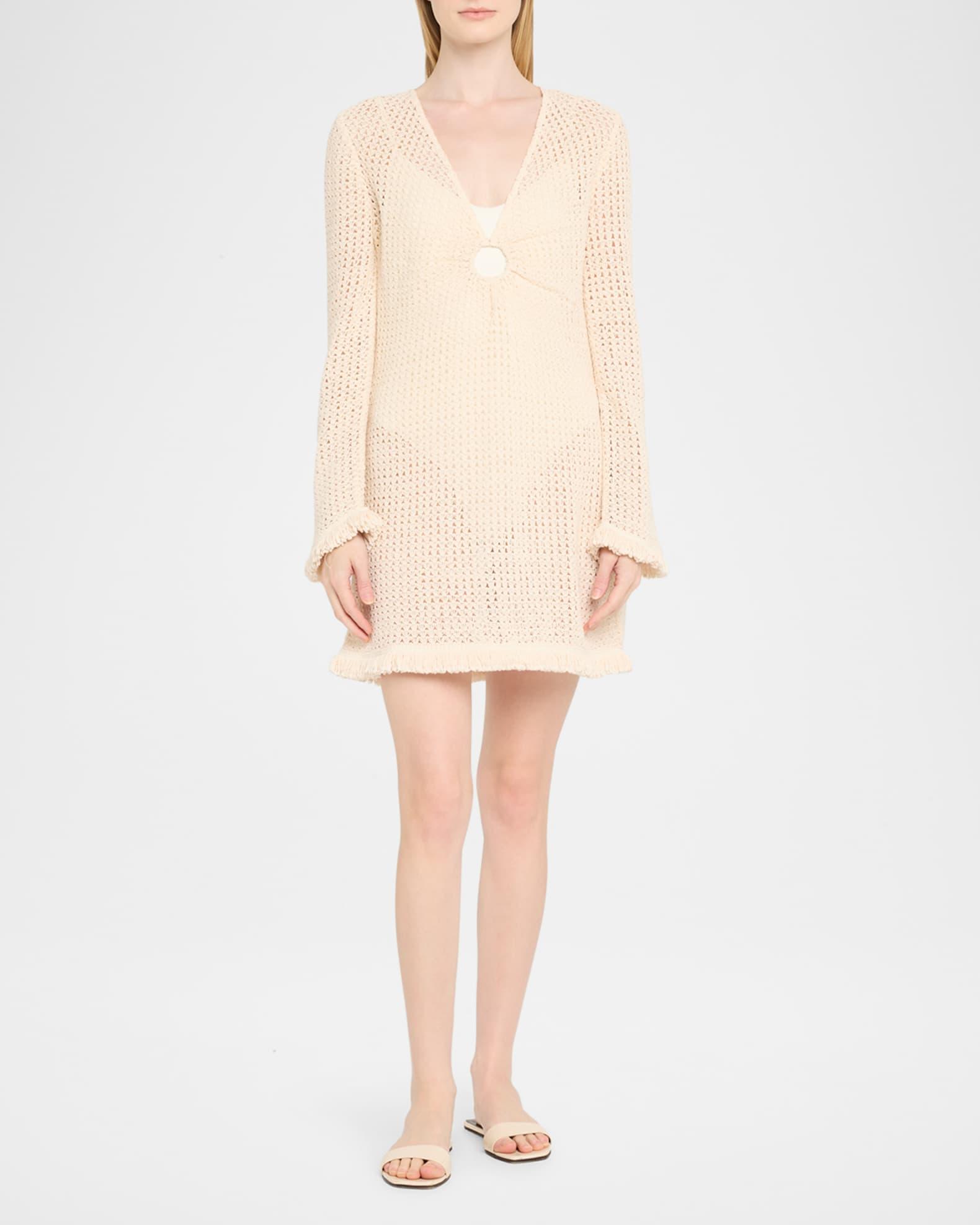Complete with tonal fringe trim, the Cassie sun dress coverup by Ramy Brook is rendered in a crochet knit V neckline with an underbust ring accent Long sleeves Hem falls above the knee Shift silhouette Slipover style Cotton Hand wash Imported
