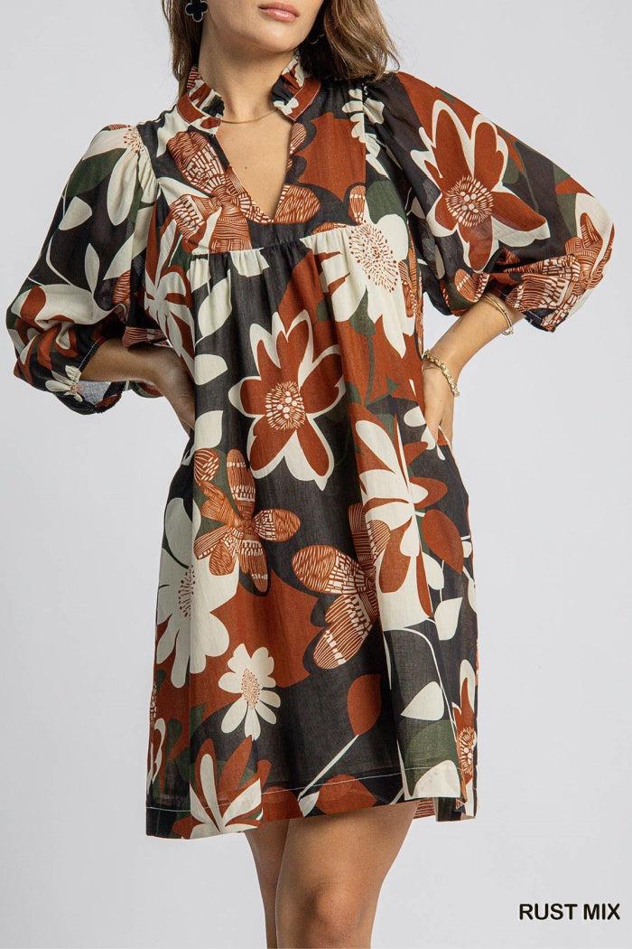 Adorable 3/4 sleeve, floral print dress with v-neck and lining. Model is wearing a small. Refer to measurements for your perfect fit.