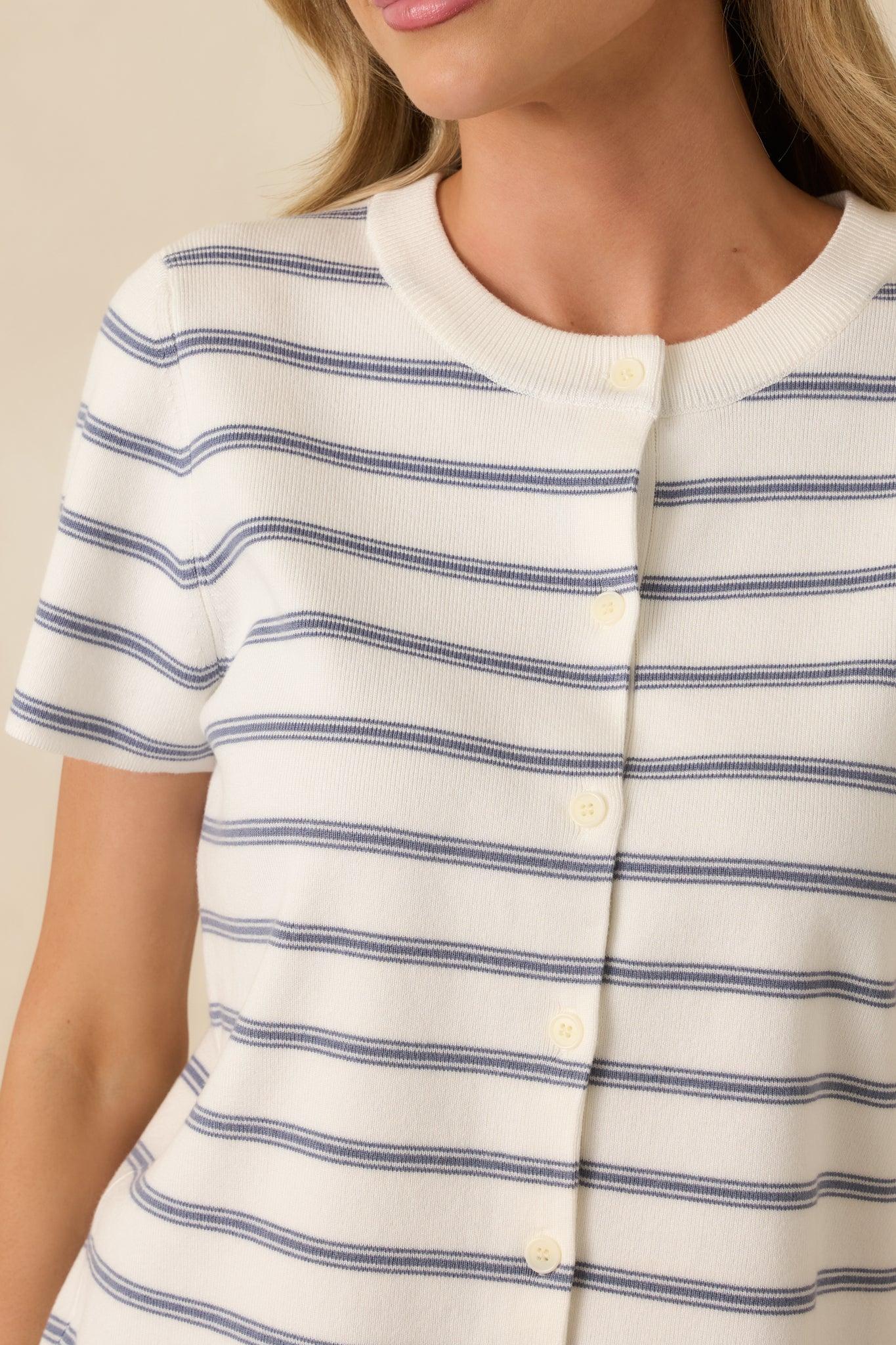 Classic stripes meet easy polish in the Casual Authority Navy Stripe Knit Button Front Short Sleeve Top. Designed in a soft, lightweight ribbed knit, it features a timeless crew neckline and full button-front closure for versatile styling—wear it fully buttoned as a top or slightly open for a relaxed feel. The horizontal navy striping adds a crisp, coastal-inspired touch, while the short sleeves and gently tailored fit create a flattering, everyday silhouette. Comfortable yet refined, it’s the kind of piece that pairs effortlessly with denim, trousers, or skirts for a look that feels put-together without trying too hard. 70% Viscose & 30% Nylon Unlined Manufactured in China Designed in the USA Model is 5'8" and wearing size small, clipped, model is a true x-small