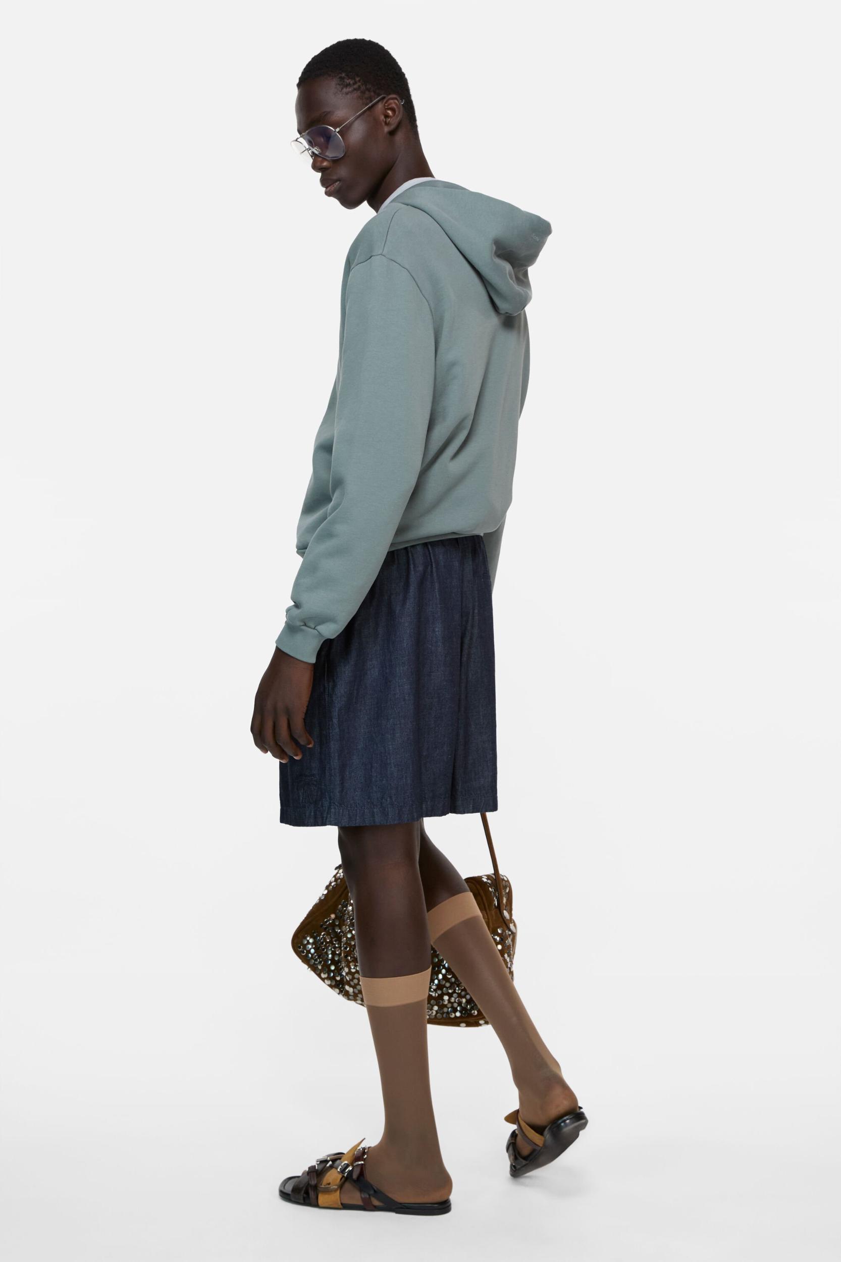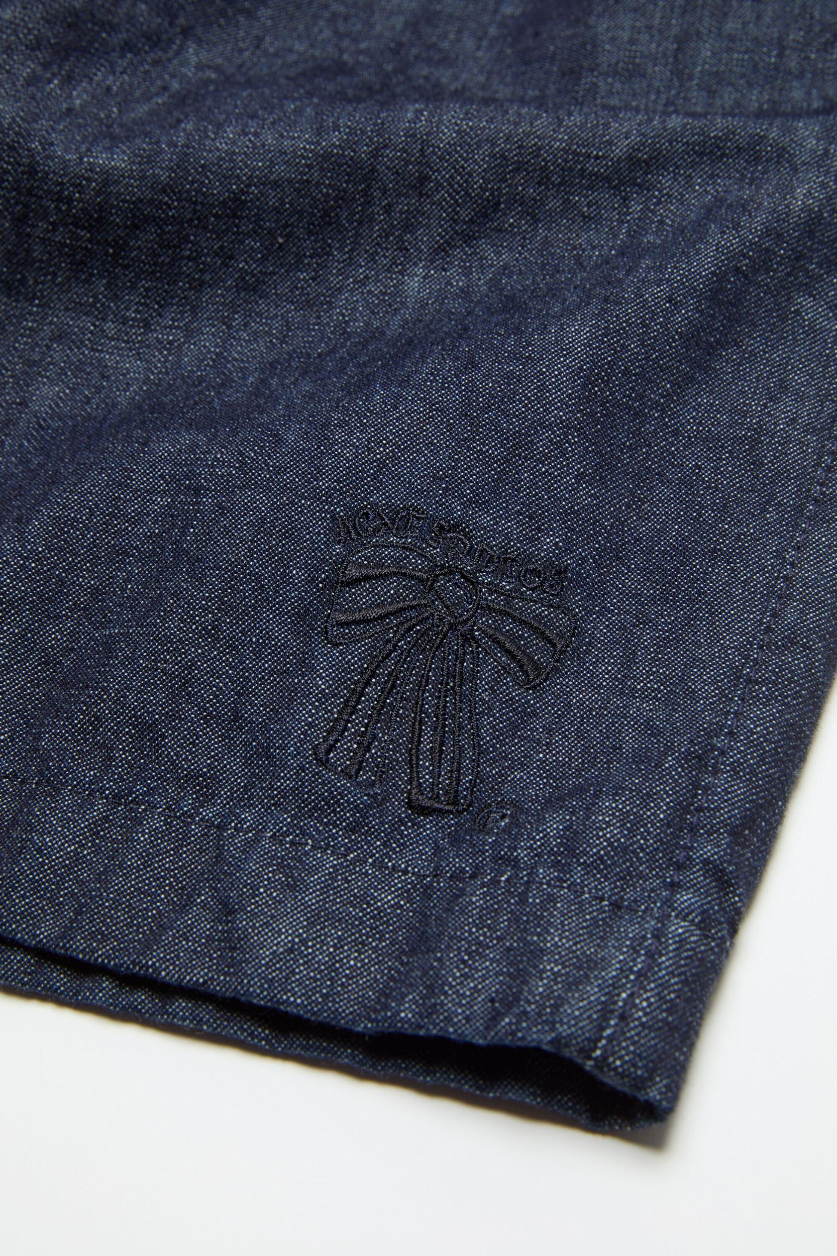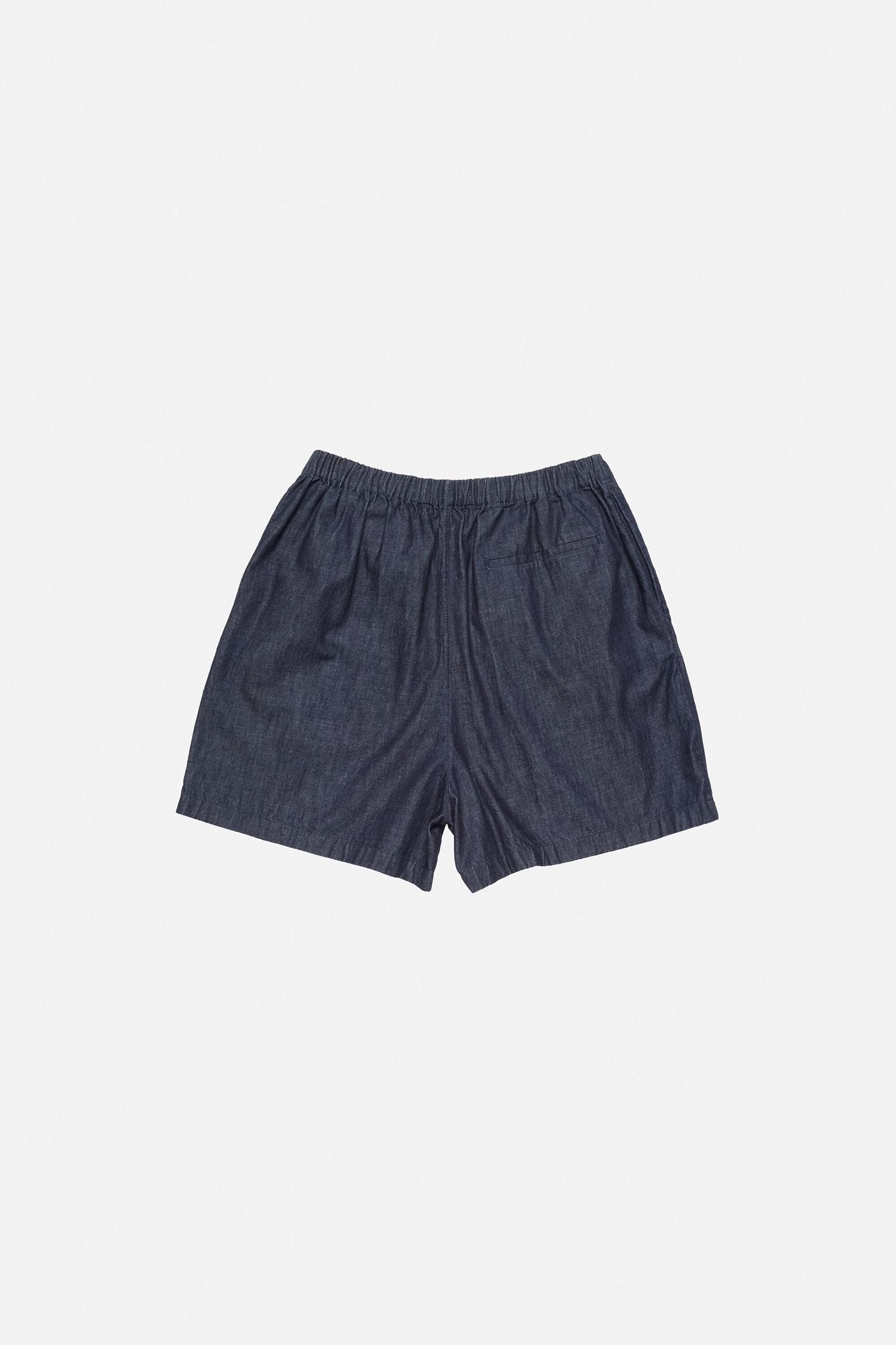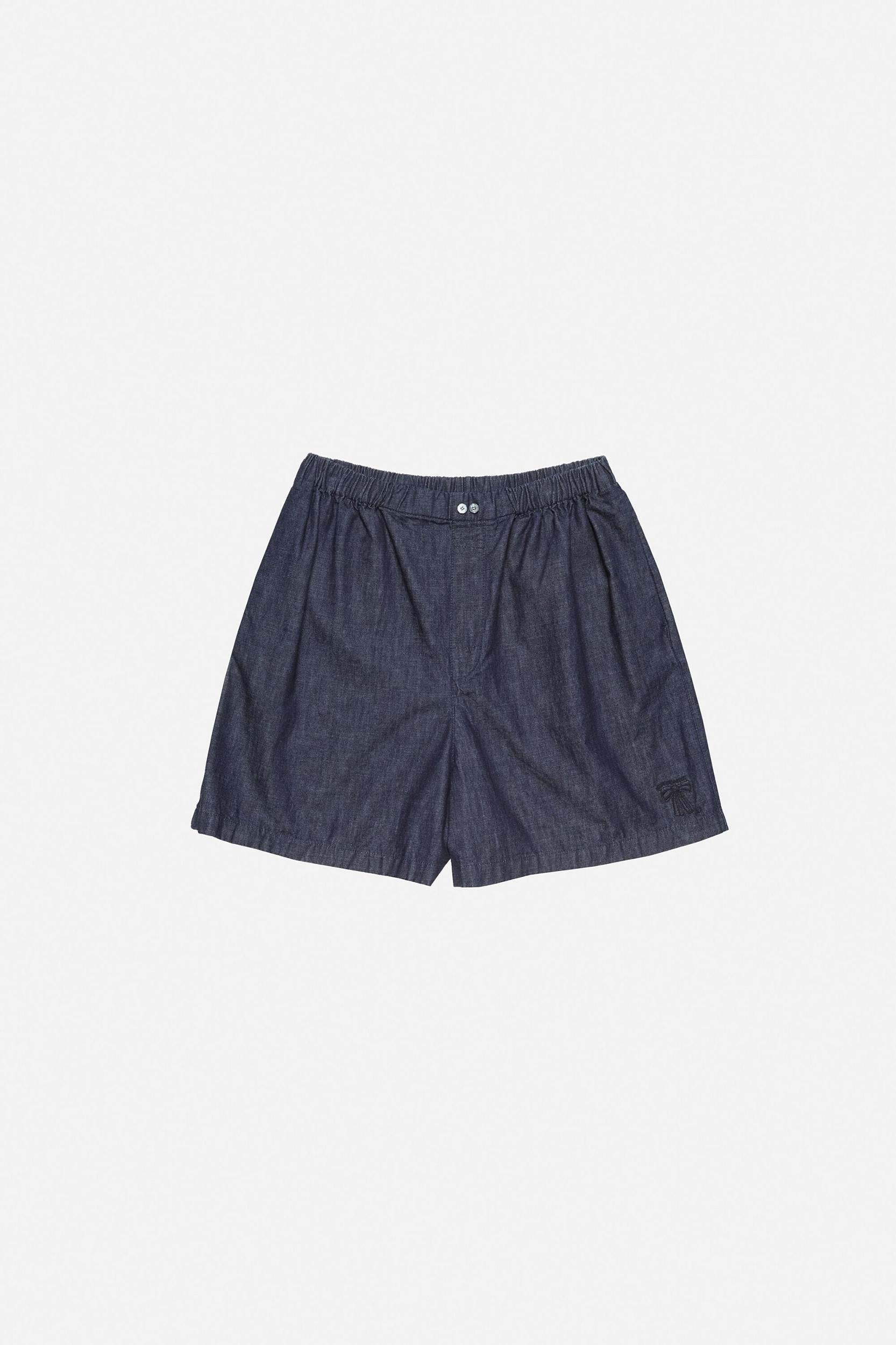 Casual shorts crafted from washed organic cotton denim, featuring an elasticated waist with branded button details and a faux fly. Completed with side pockets and an embroidered seasonal bow logo on the hem. Cut to a regular fit with a mid waist and above-knee length. FN-MN-SHOR000330