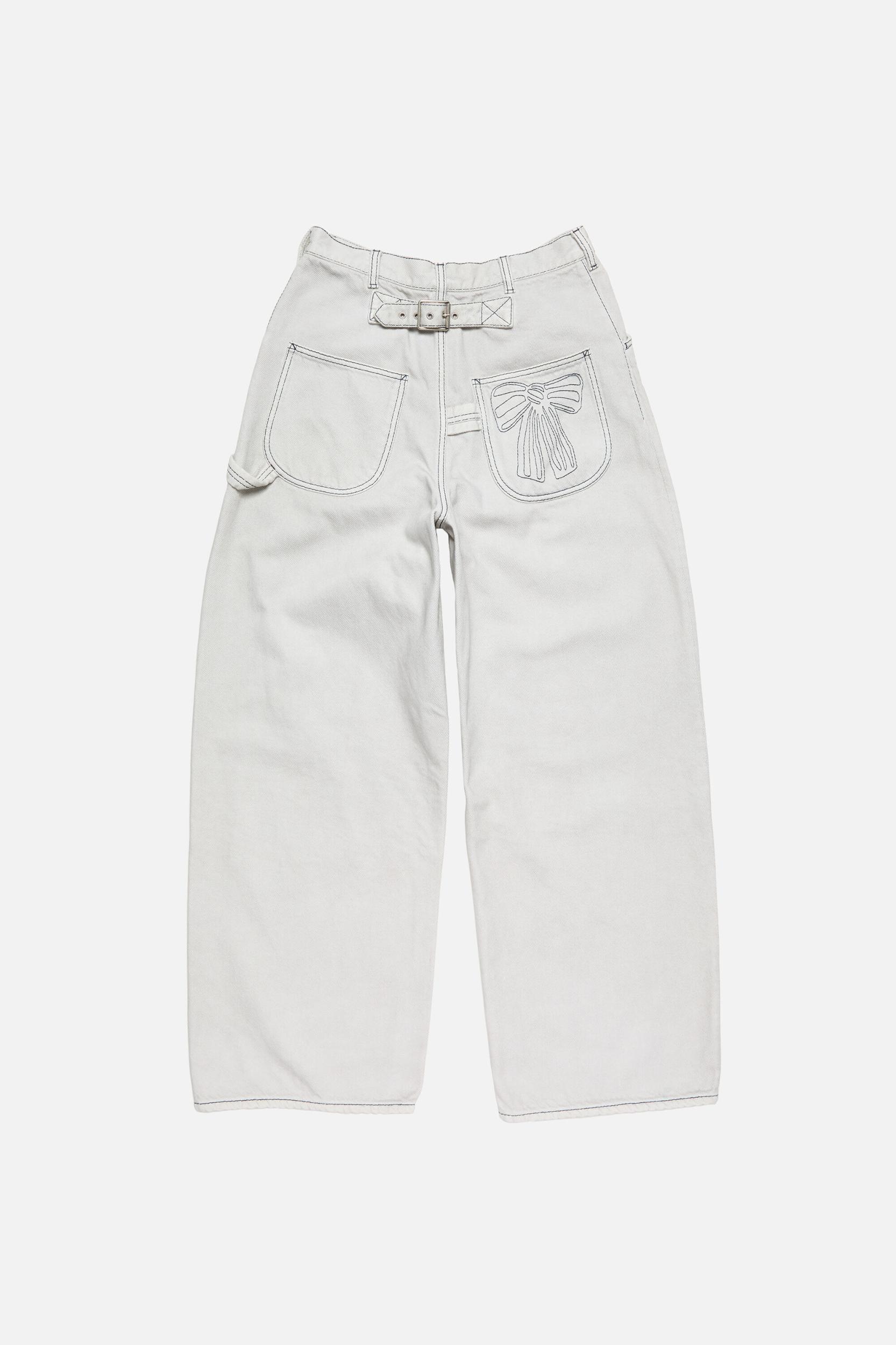 Casual trousers crafted from organic cotton denim with contrast stitching, designed with a classic 5-pocket construction. Complete with a back cinch and embroidered seasonal bow artwork on the back pocket. Cut to a loose fit with a mid waist and baggy leg. FN-MN-TROU001210