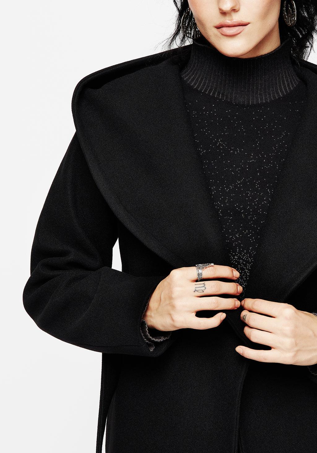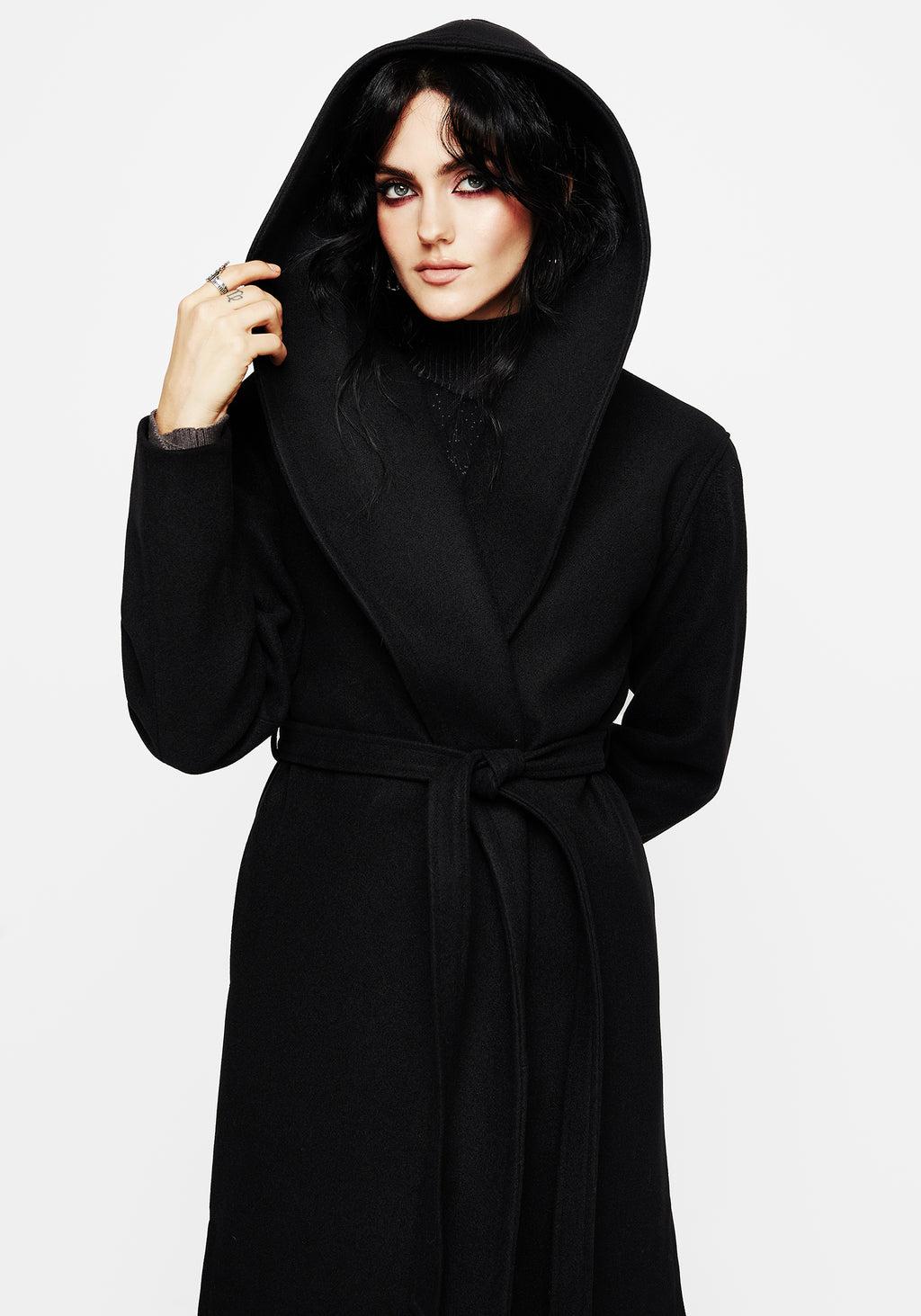 Bury me in all my favourite colours - Black belted coat with hood - Roomy sizing for easy layering in cold weather - Longline length maximises snug appeal - Oversized lapel & full length cuffs - Roomy hood to protect you from the elements - Two handy side pockets - Fastens with a self-fabric belt cinched at waist (casual, carefree, cosy) - Soft-touch black wool effect fabrication - Silky inner lining with coffin motif 100% recycled polyester
