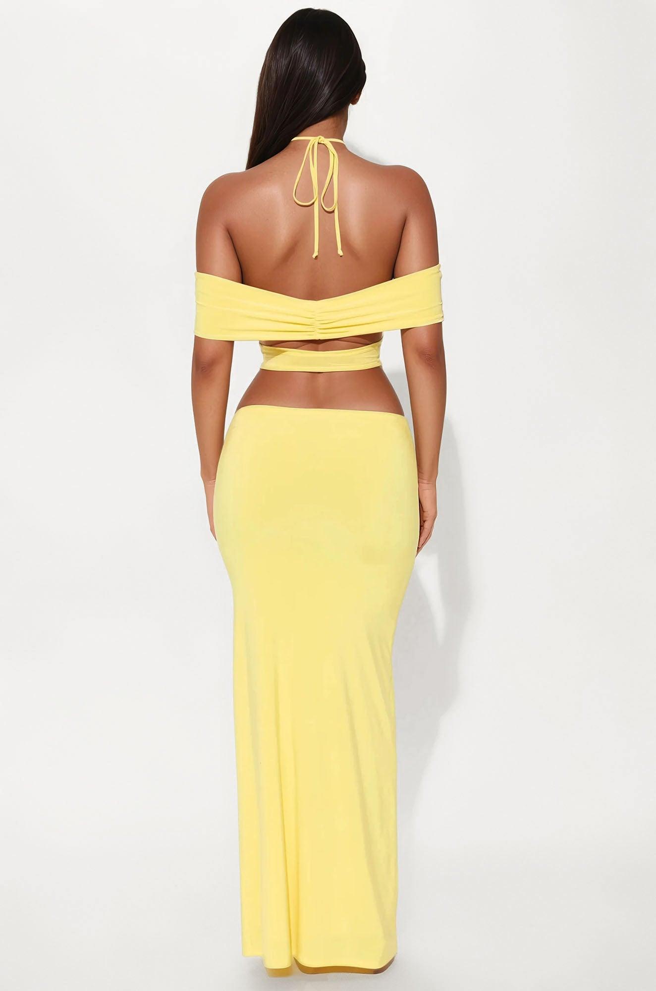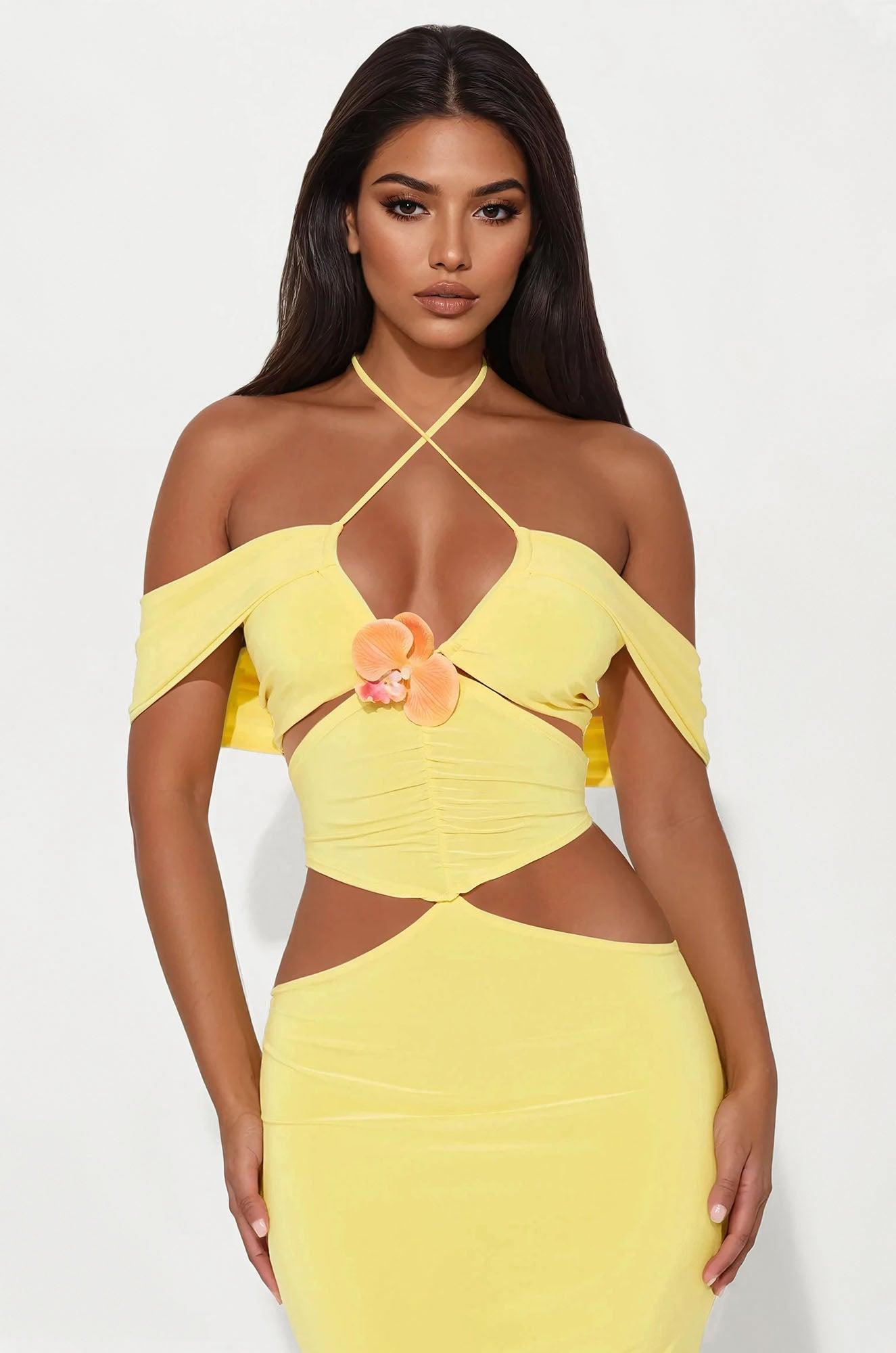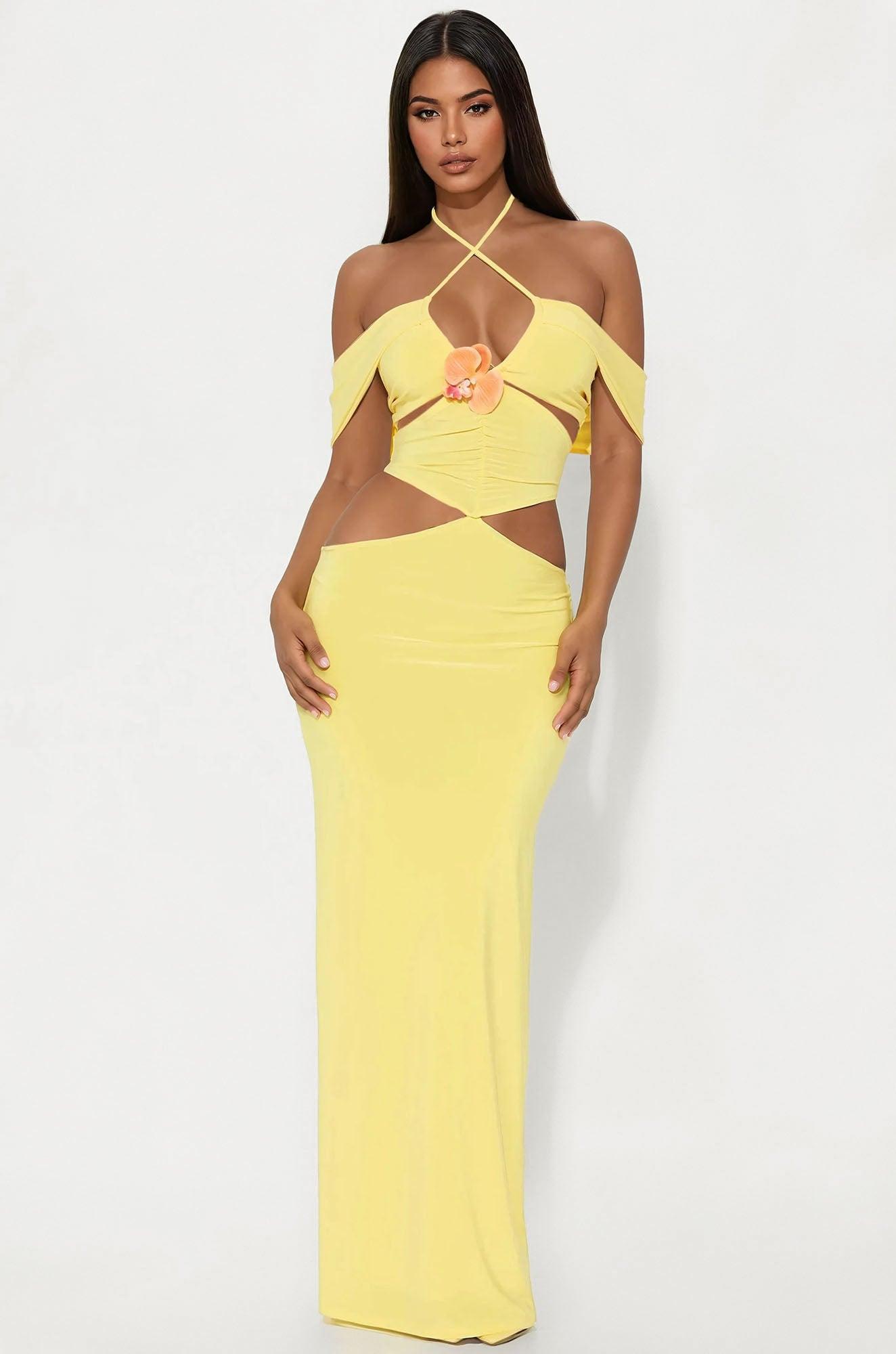 Available In Yellow And Kelly Green. Maxi Dress Halter V- Neckline Flower Brooch Ruched Cut Out Lined Stretch Self: 95% Polyester 5% Spandex Lining: 100% Polyester Imported California Proposition 65WARNING: Cancer and Reproductive Harm - www.P65Warnings.ca.gov.