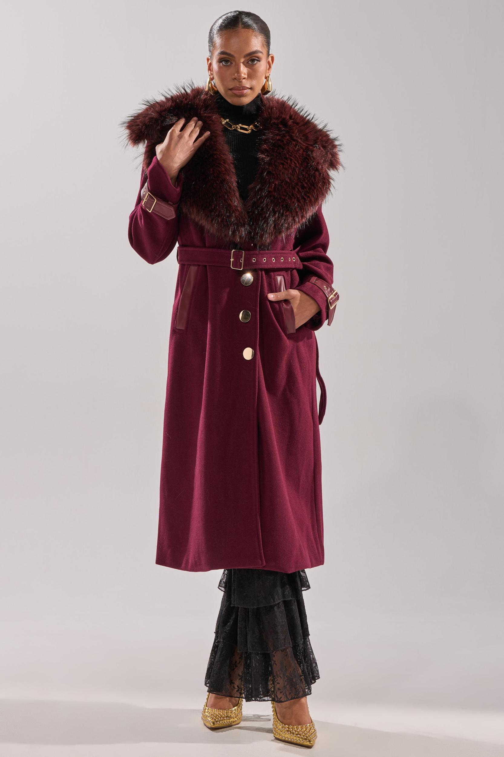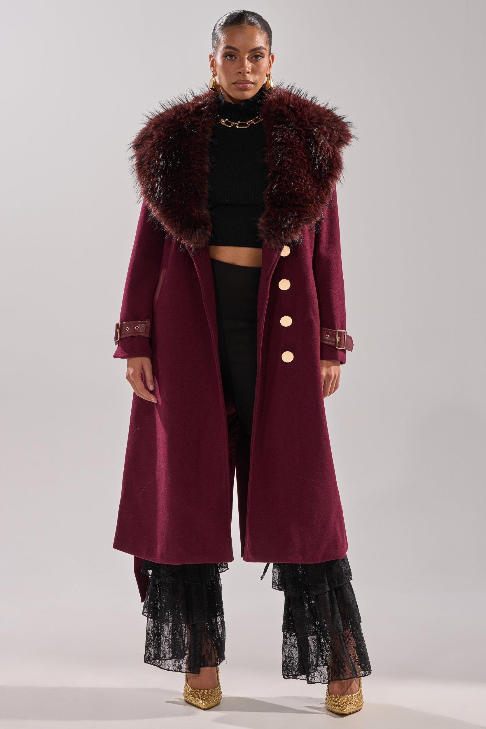 The AKIRA Label Catalina Fur Collar Trench is fur-trimmed perfection. This elegant, longline jacket is crafted from a buttery wool-like fabric and boasts an oversized, tonal removable faux fur collar, lightly padded shoulders for added structure, long sleeves with belted cuffs, a matching adjustable waist belt with gold-tone hardware, dual waist pockets, a front button panel, and a sleek inner lining. Complete with a structured fit. Style over knit pieces and thermal tops for a cozy-chic finish. - Shell 1: 100% Polyester, Shell 2: 55% Polyester 45% PU, Lining: 100% Polyester, Fur: 100% Polyester- Dry Clean Only- No Stretch- Imported (all measurements approximate from size small)- 46” Shoulder to Hem- 16” Shoulder to Shoulder- 23” SleevesProduct ID: 1061215 (all measurements approximate from size 1X)- 49” Shoulder to Hem- 19” Shoulder to Shoulder- 25” SleevesProduct ID: 1061218
