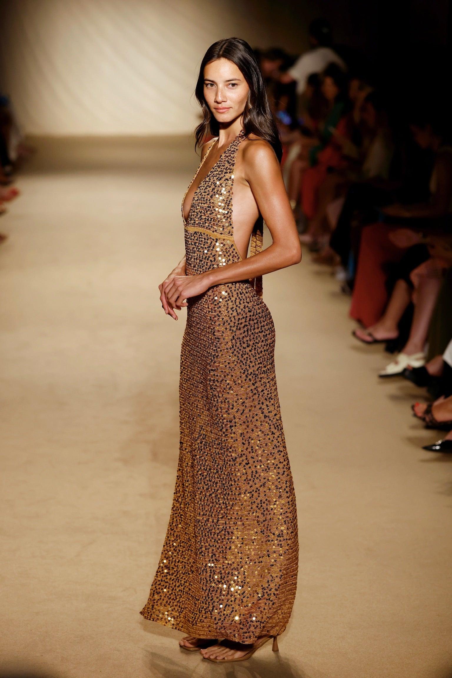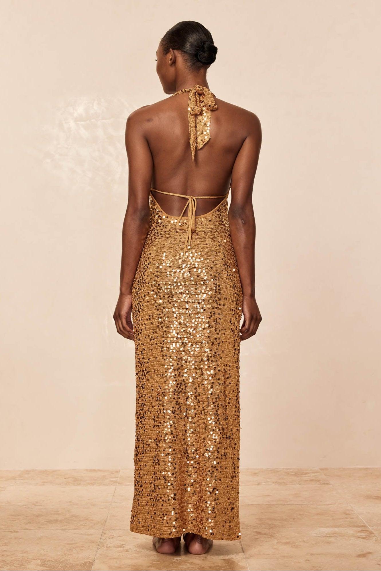 Something special Introducing our Catania Dress, designed to elevate every occasion and enhance your confidence with every step. This delicate halter dress is tailored to embrace and flatter your figure while ensuring a perfect fit each wear. Immerse yourself in the luxury of feeling special each time you slip into this timeless piece that seamlessly combines comfort and elegance.Features:Plunging v neck halterAdjustable neck ties and underbust tieSide slitPull onUnlined, semi-sheerCare:Dry clean only.This garment is very delicate. In order to minimize snagging, please avoid rough surfaces and be careful when wearing jewelry and bags. Knitwear can stretch when hung so we strongly suggest folding this garment to store, this will ensure your garment holds its designed shape.