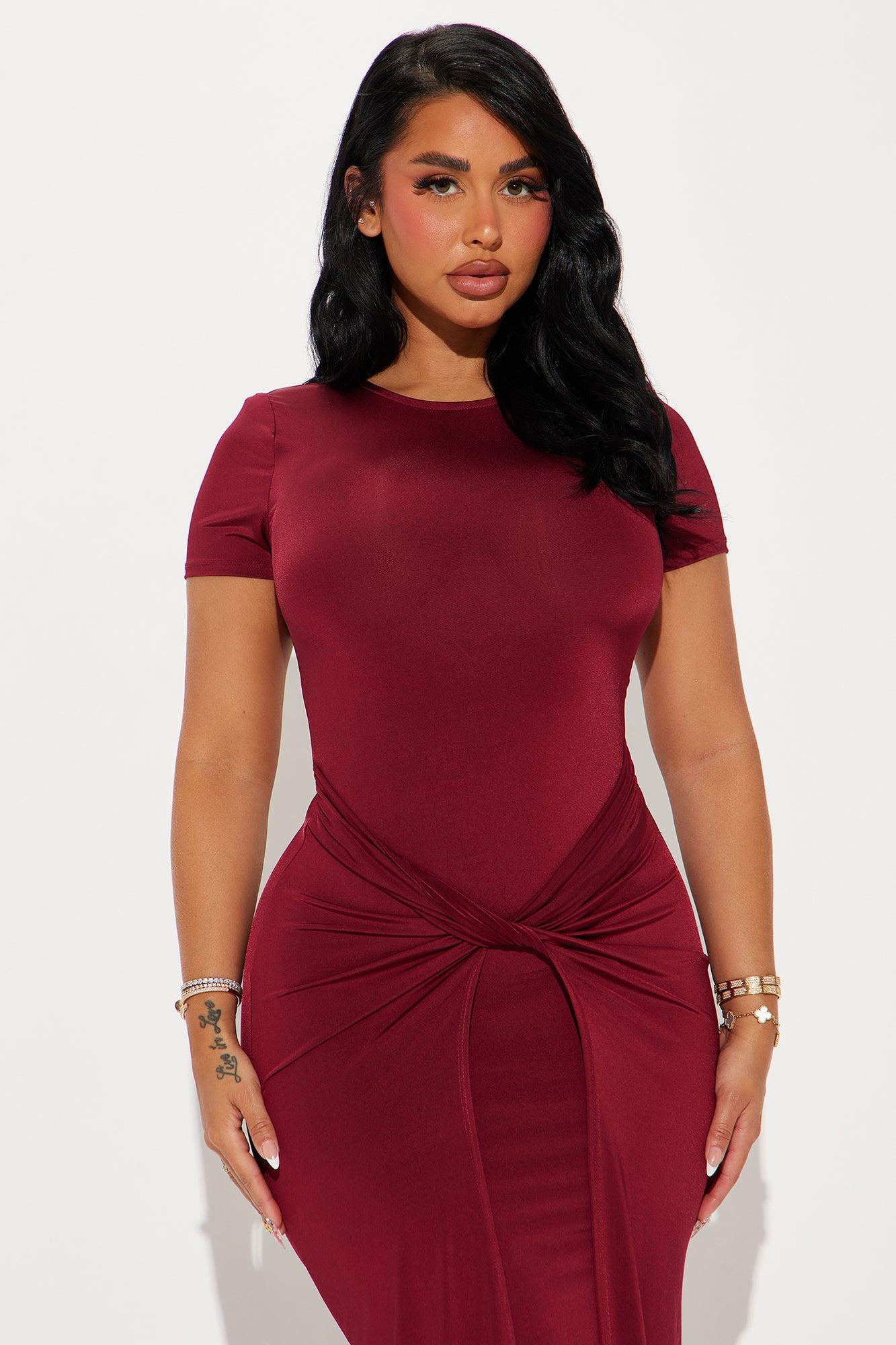 Available In Black And Brick Red. Maxi Dress Shot Sleeve Crew Neck Twist Detail Back Zipper Stretch 95% Polyester 5% Spandex Imported California Proposition 65 WARNING: Cancer and Reproductive Harm - www.P65Warnings.ca.gov.