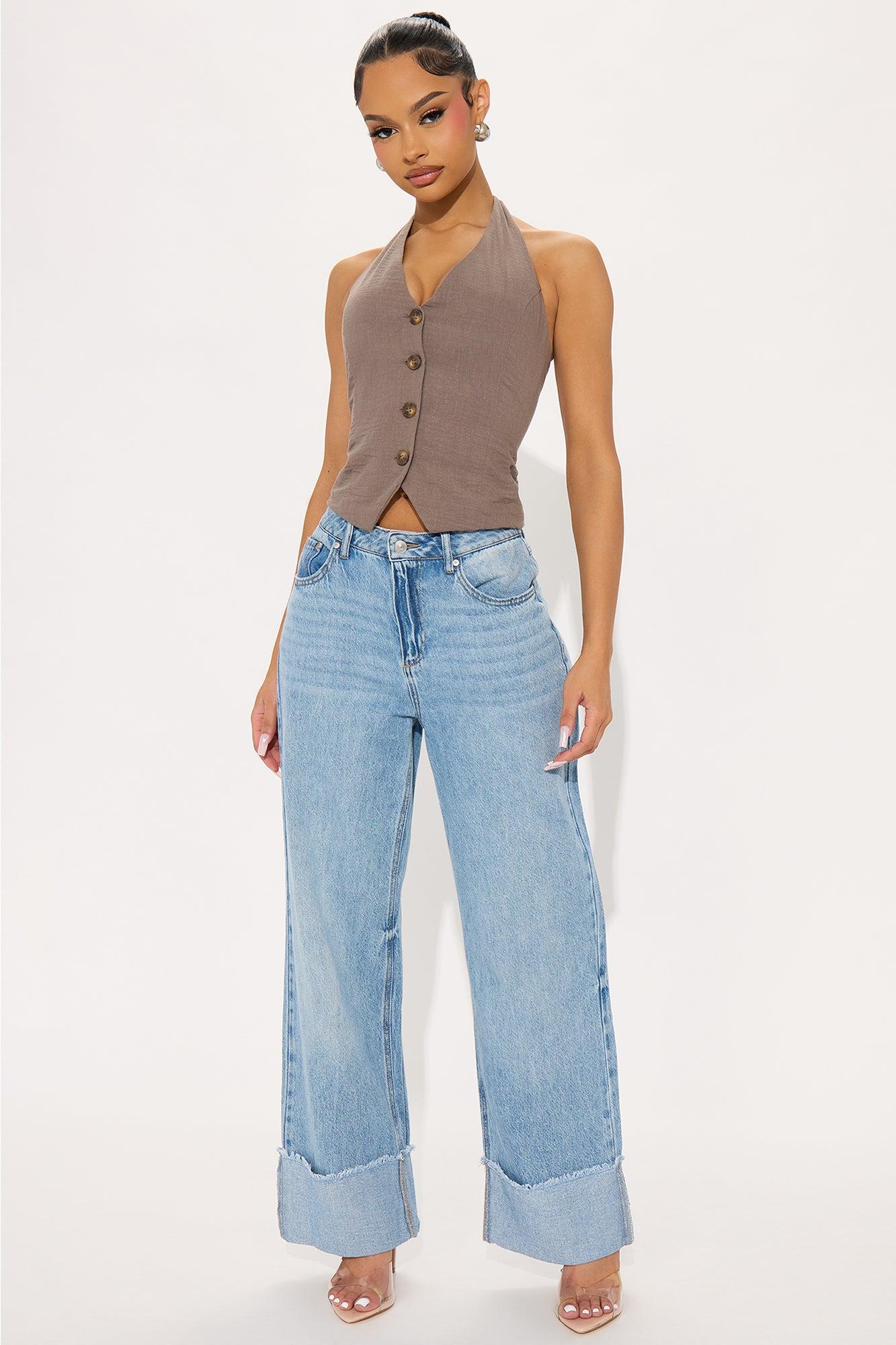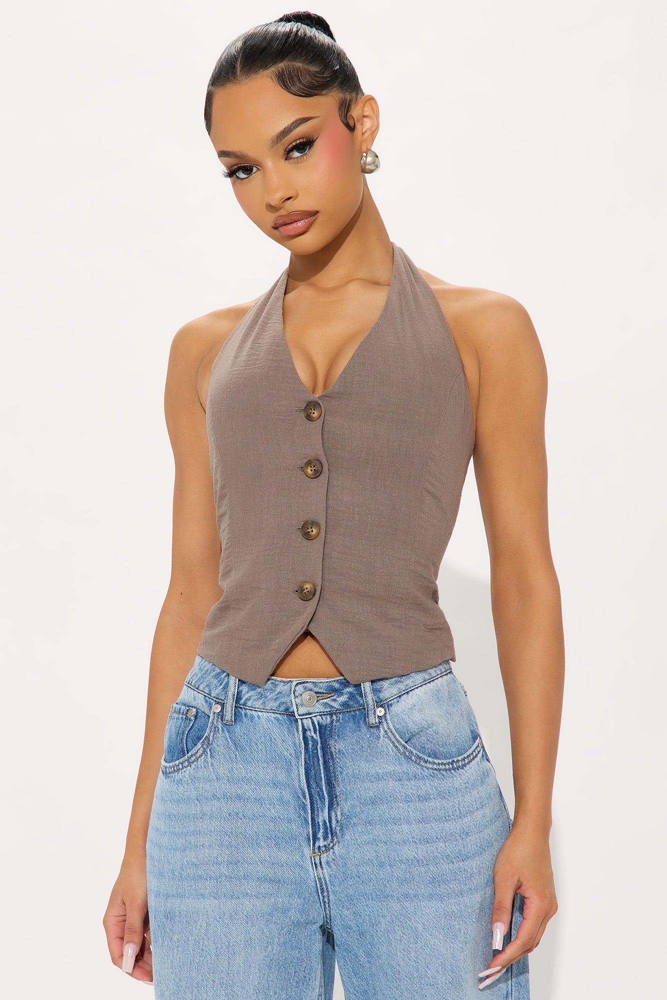 Available In Mocha, Black, Ivory, And Sand. Linen Vest Button Up Tie Neck Fully Lined Non Stretch Self: 100% Polyester Lining: 80% Polyester 20% Cotton Imported