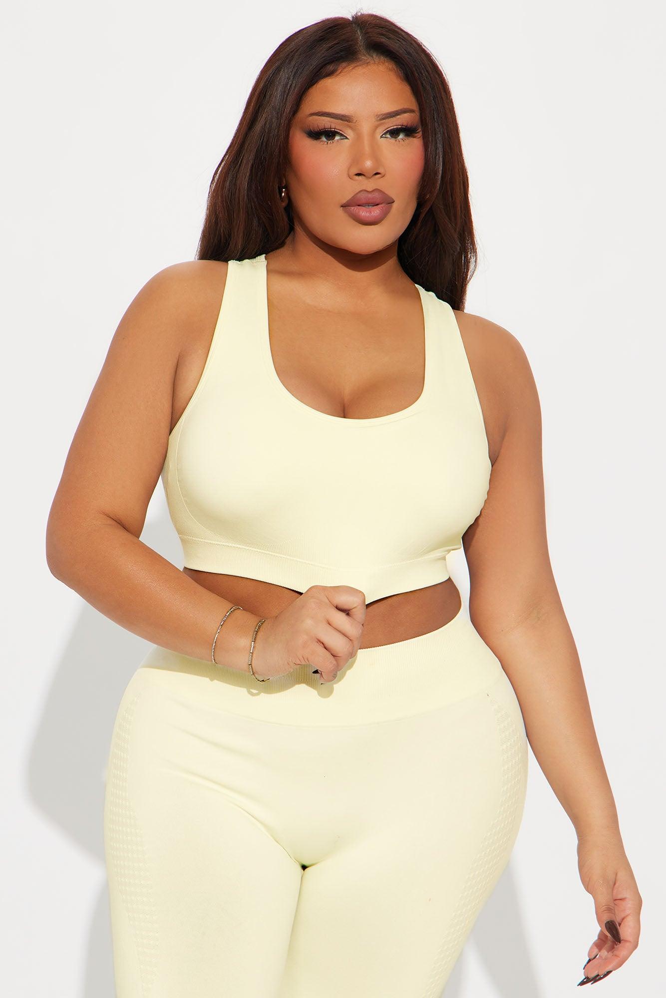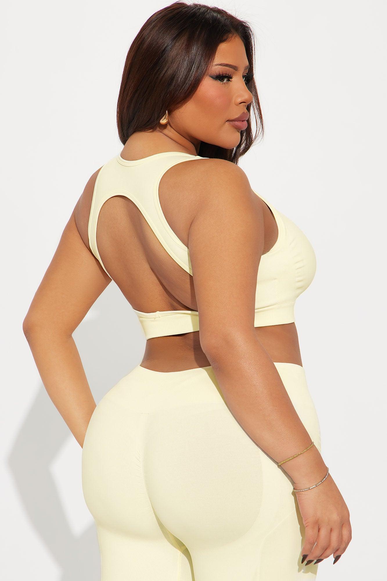 Available In Black, Cream And Lilac. Sports Bra Scoop Neck Sleeveless Seamless Shaping Detail Cut Out Detail Low Impact Stretch Pair With "Catch A Break Seamless Active Legging" Shell: 90% Nylon 10% Spandex Imported
