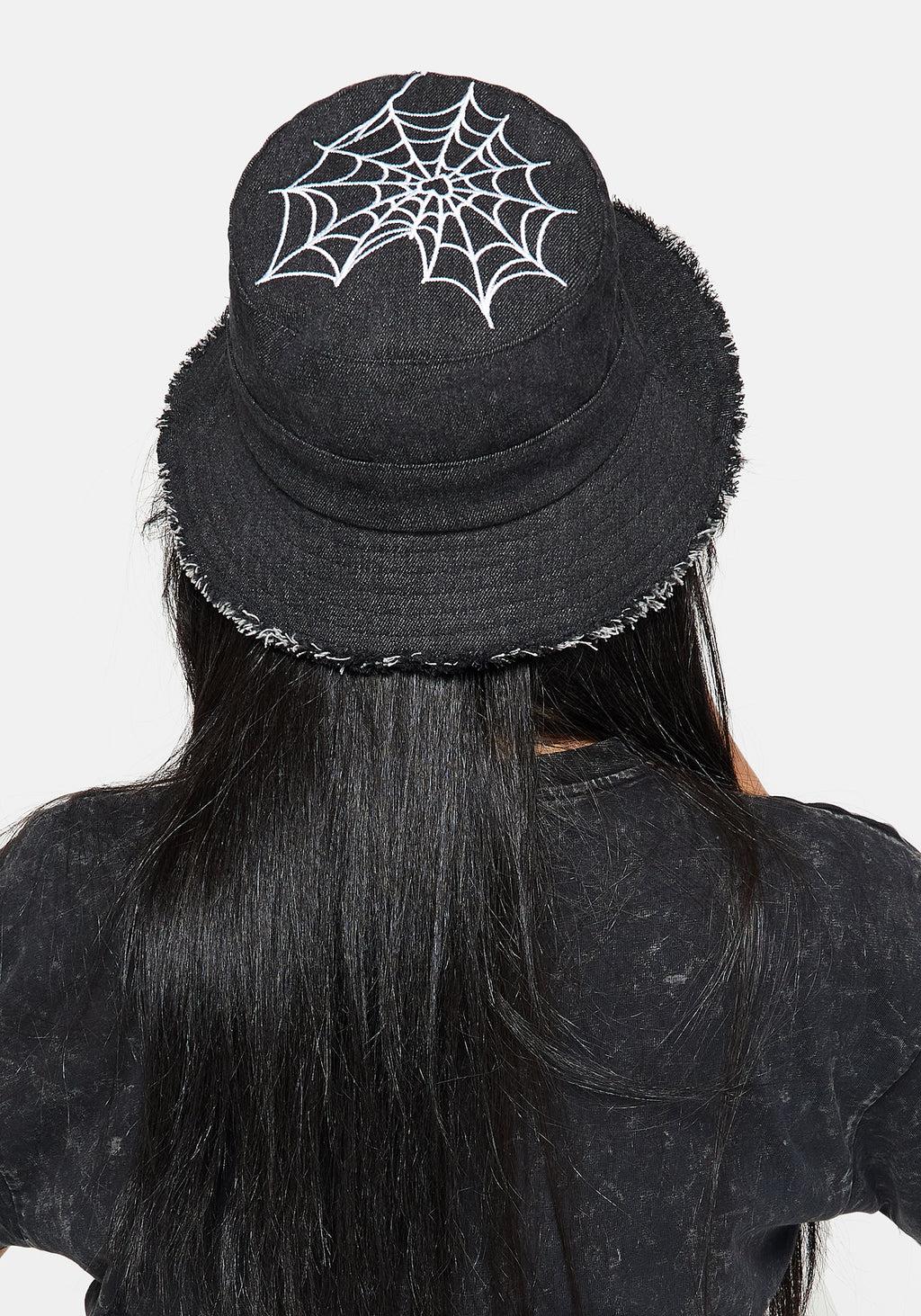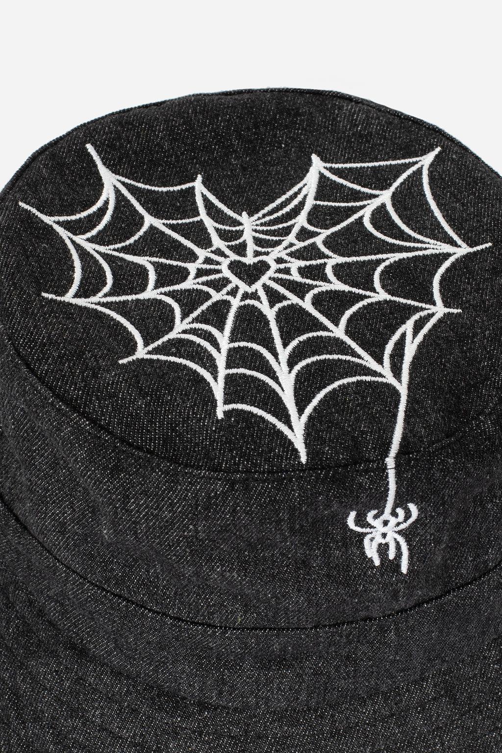 Catch flies, not feelings- Black embroidered denim bucket hat - Structured dome with a sloping brim (casts shade) - Frayed hem gives that distressed look - Sturdy denim fabrication (structured but breathable) - Soft lining & built-in sweatband for comfort - White spiderweb embroidery (spider dangles over the band) - Be sun safe in this chill hat 75% cotton, 25% polyester