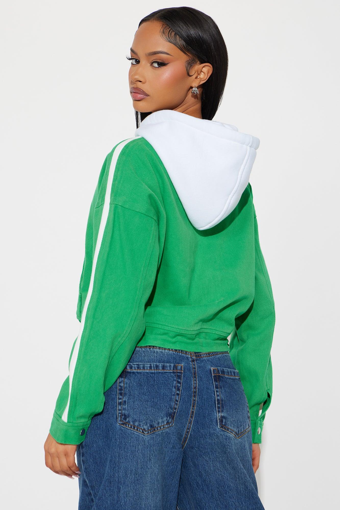 Available In Cream And Kelly Green. Denim Jacket Hooded Long Sleeve Denim Rigid Stripe Full Zip Pockets Non Lined Shell:100%Cotton Contrast: 35% Cotton 65% Polyester Imported California Proposition 65WARNING: Cancer and Reproductive Harm - www.P65Warnings.ca.gov.