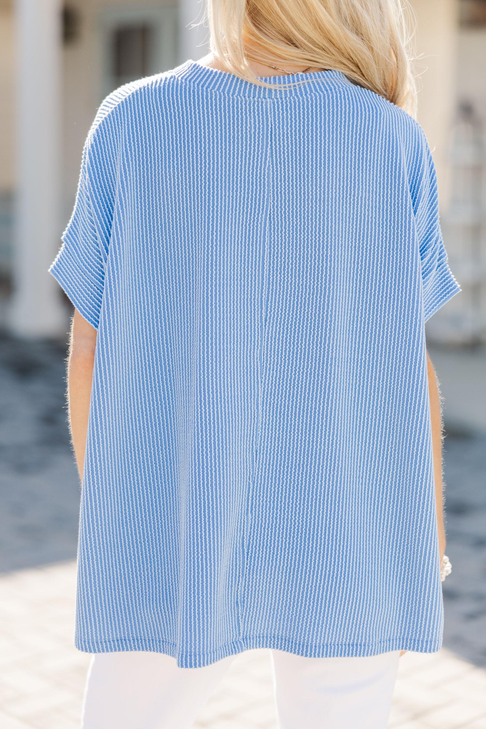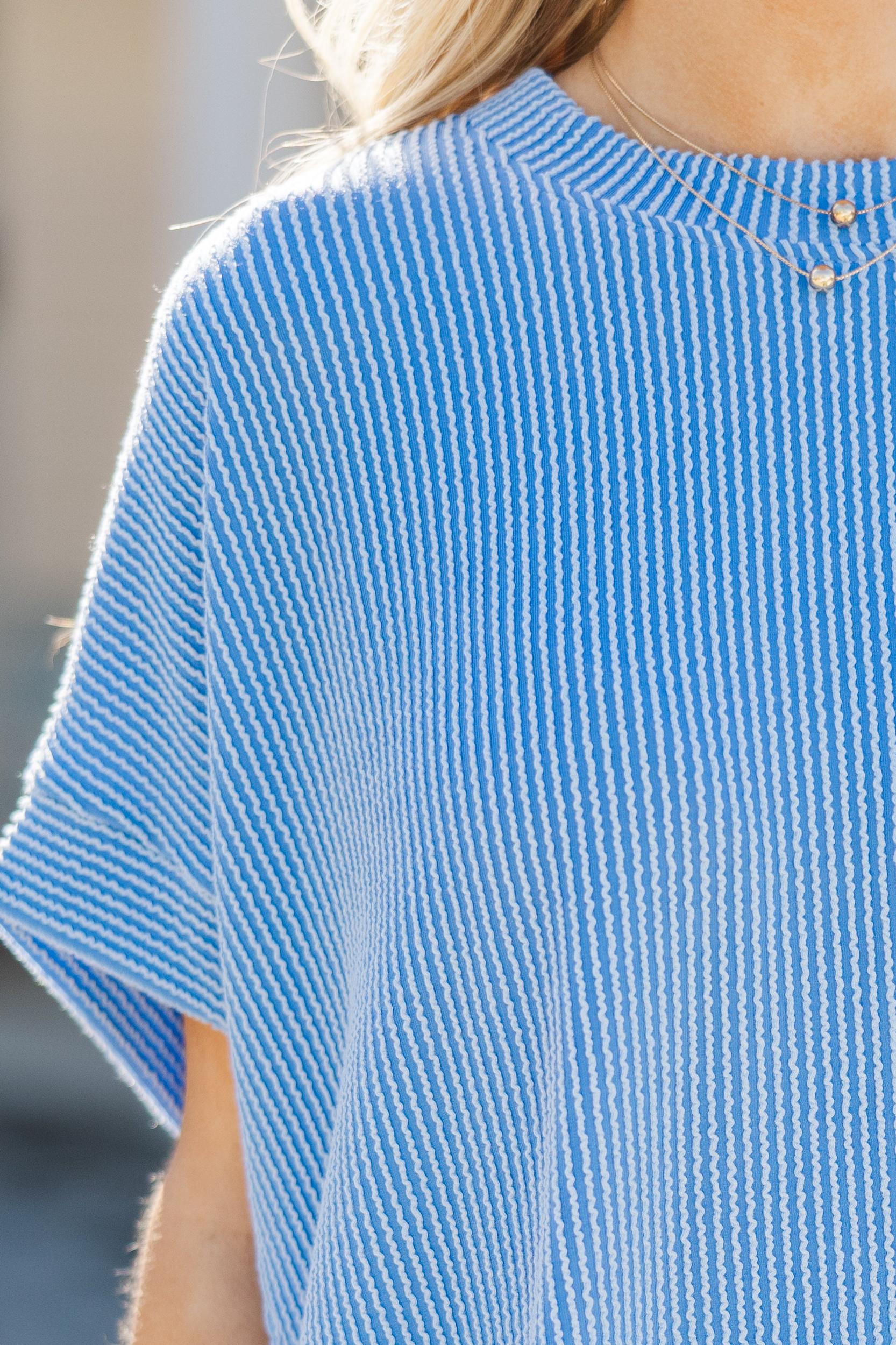 Soft, cute, and seriously comfy—this blue ribbed top is your new go-to! The relaxed fit and soft fabric make it perfect for everyday wear, while the gorgeous color adds instant fun. Toss it on with white jeans or denim shorts and let the good vibes roll. You’ll be catching compliments left and right! Round neckline Short sleeves Ribbed fabric Oversized fit Material has a generous amount of stretch Baileigh is wearing the small.