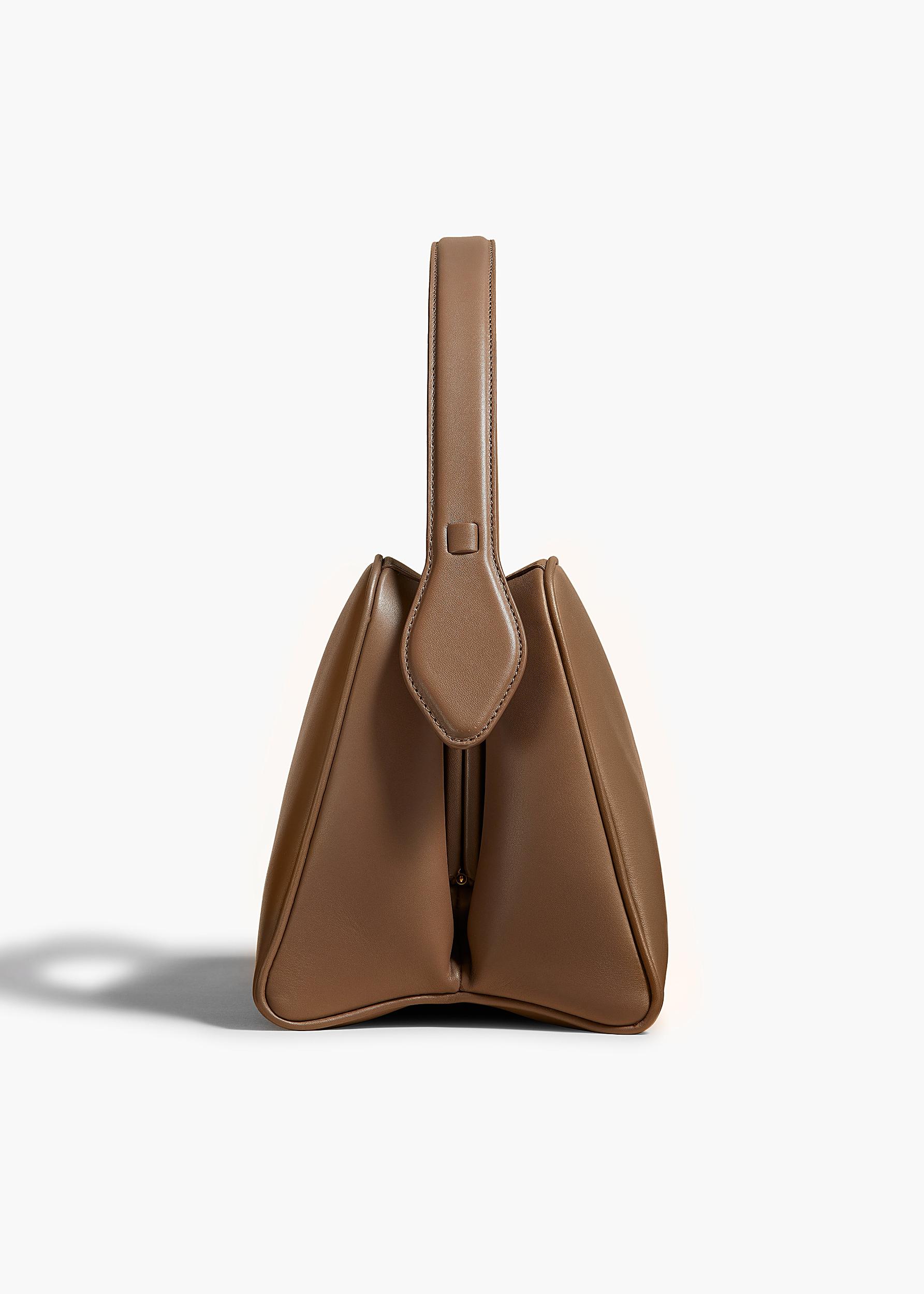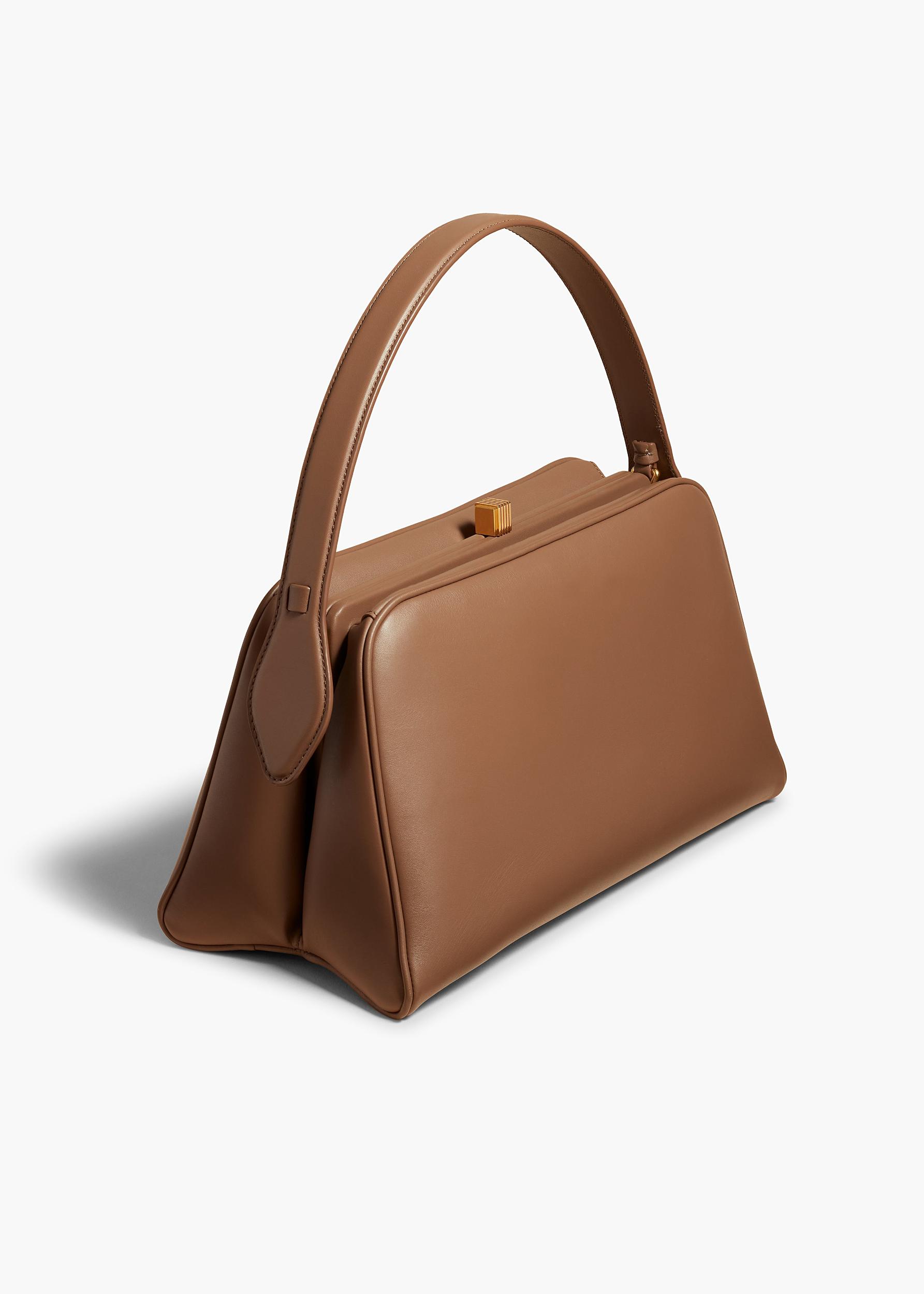 Structured by a covered frame, this top-handled silhouette is at once intricate and nimble. With custom kiss-lock clasp plated in 18-karat gold.