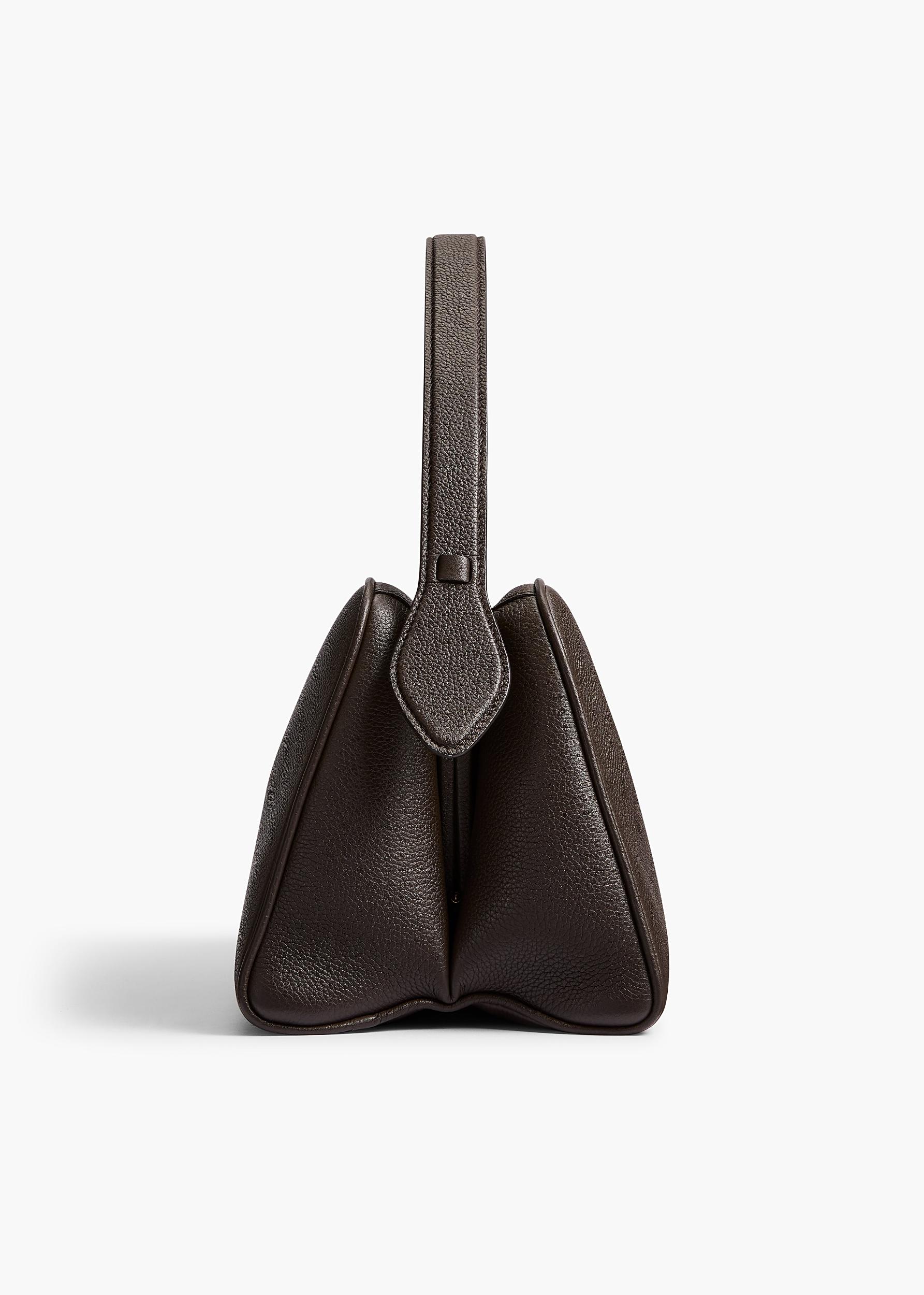Structured by a covered frame, this top-handled silhouette is at once intricate and nimble. With custom kiss-lock clasp plated in 18-karat gold.