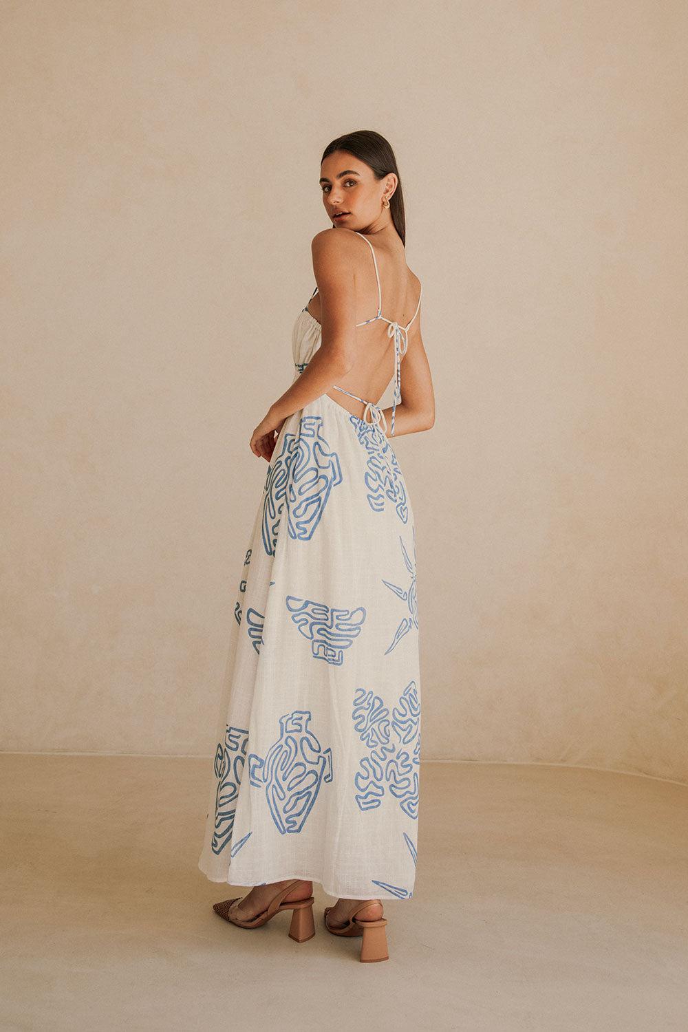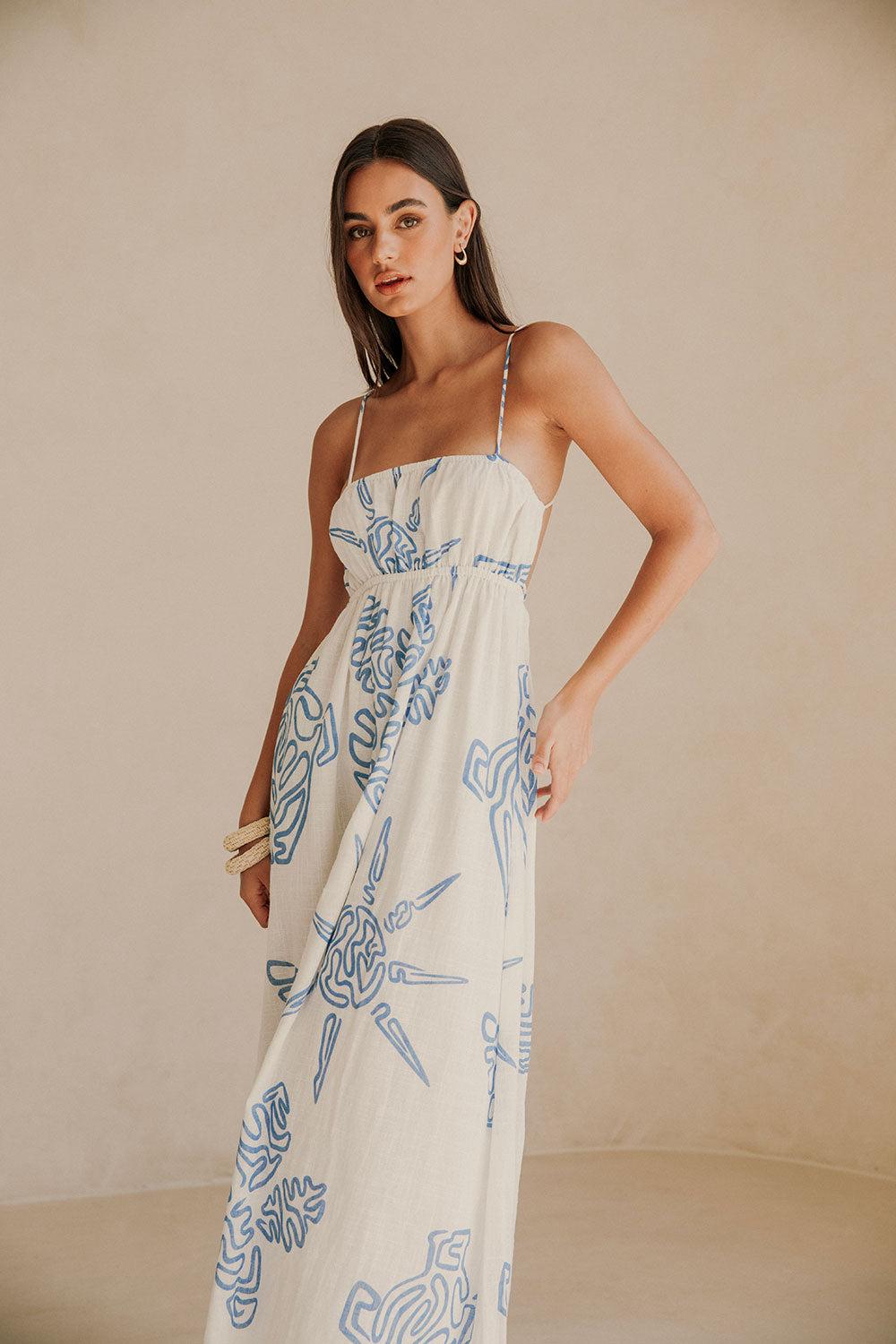 Perfect for a long lunch, the Catie Dress is made from a high quality cheesecloth cotton fabric with our exclusive Evoke Blue print. It features an open back, rouleau straps and ties at back, low slung back waist, straight neckline and a flowy maxi length skirt. Dress it up with the Dia Heels or keep it casual with the Kia Sandals! Designed exclusively by Sabo.