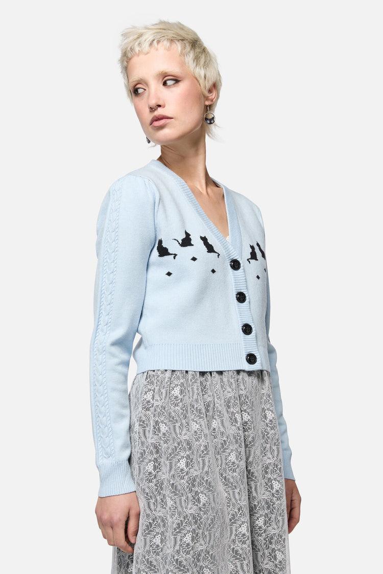 Purrfectly cozy and delightfully kitsch, the Catkins Cableknit Cardi by Dangerfield is made for cat lovers with a love of retro flair. This soft cotton knit features a relaxed, slightly cropped fit with decorative cable knit sleeves and simple kitty artwork at the chest. It’s the ideal layer to keep you cute, quirky, and warm all season long.Relaxed fit with slightly cropped lengthV-shaped necklineLong sleeves with cable knit detailingRibbed hem, cuffs, and necklineCat placement artwork on front chestMade from soft 100% knitted cottonAvailable in blueFabric & Care100% CottonGentle cold hand washDo not bleach or soakDo not wring or spinReshape and lay flat to dryCool iron if required