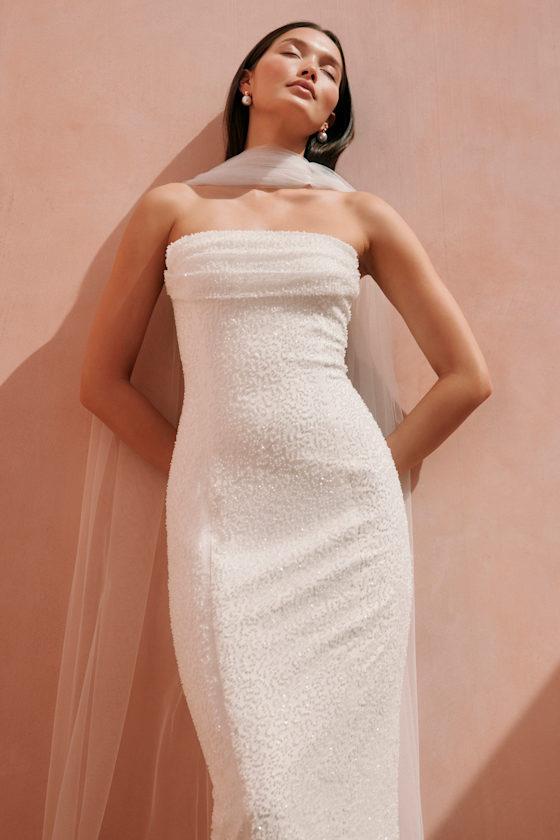 To all the brides who love to shine, this intricately bedazzled midi is ready to be the perfect party-starting reception dress. Dainty beaded details adorn a mesh overlay that shapes the bodycon silhouette, complete with a strapless bodice and a chic cowl neckline. A kick pleat at the back of the column skirt allows for effortless dancing. No-slip strips and hidden back zipper/clasp. Sash scarf not included.