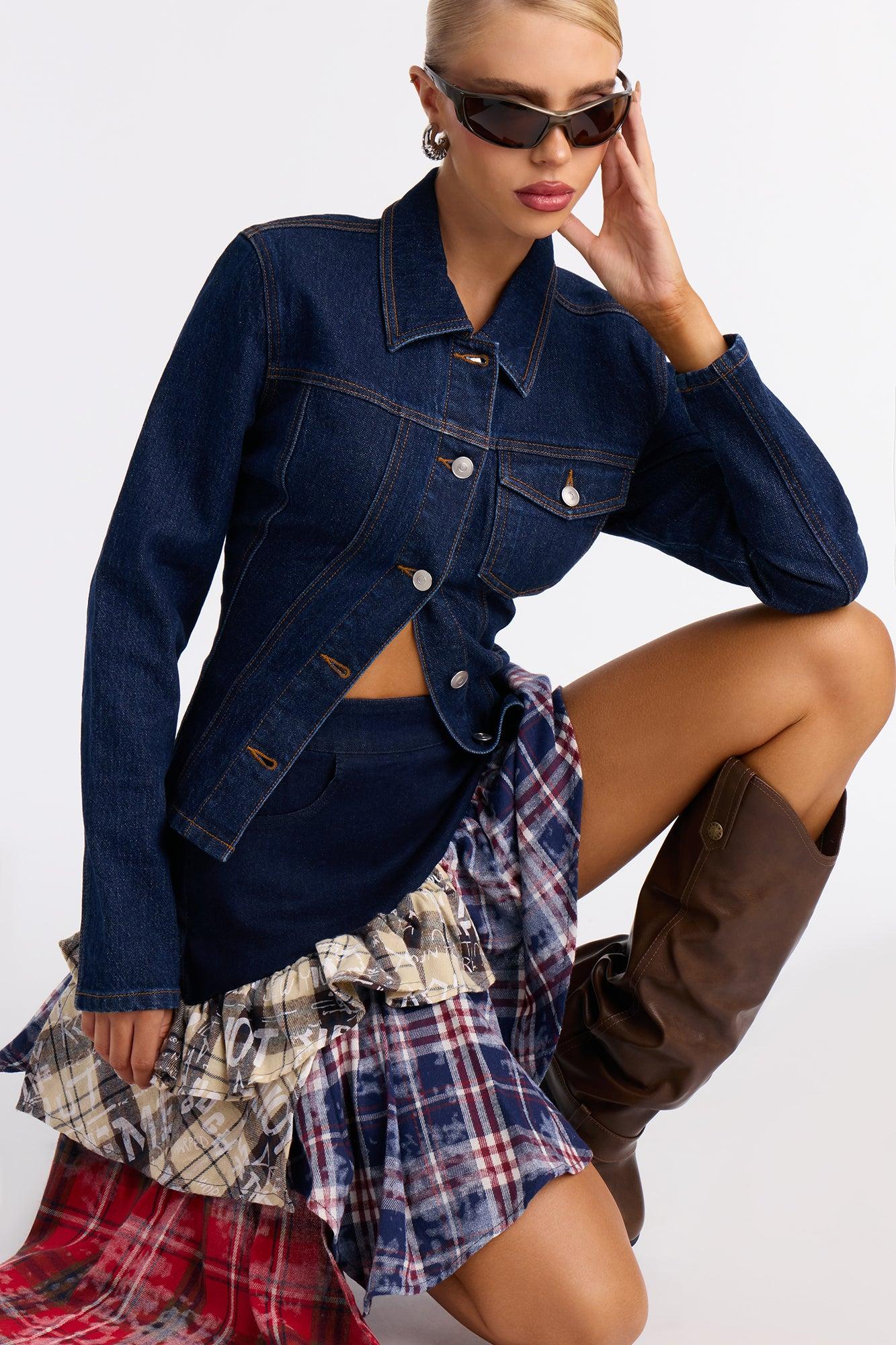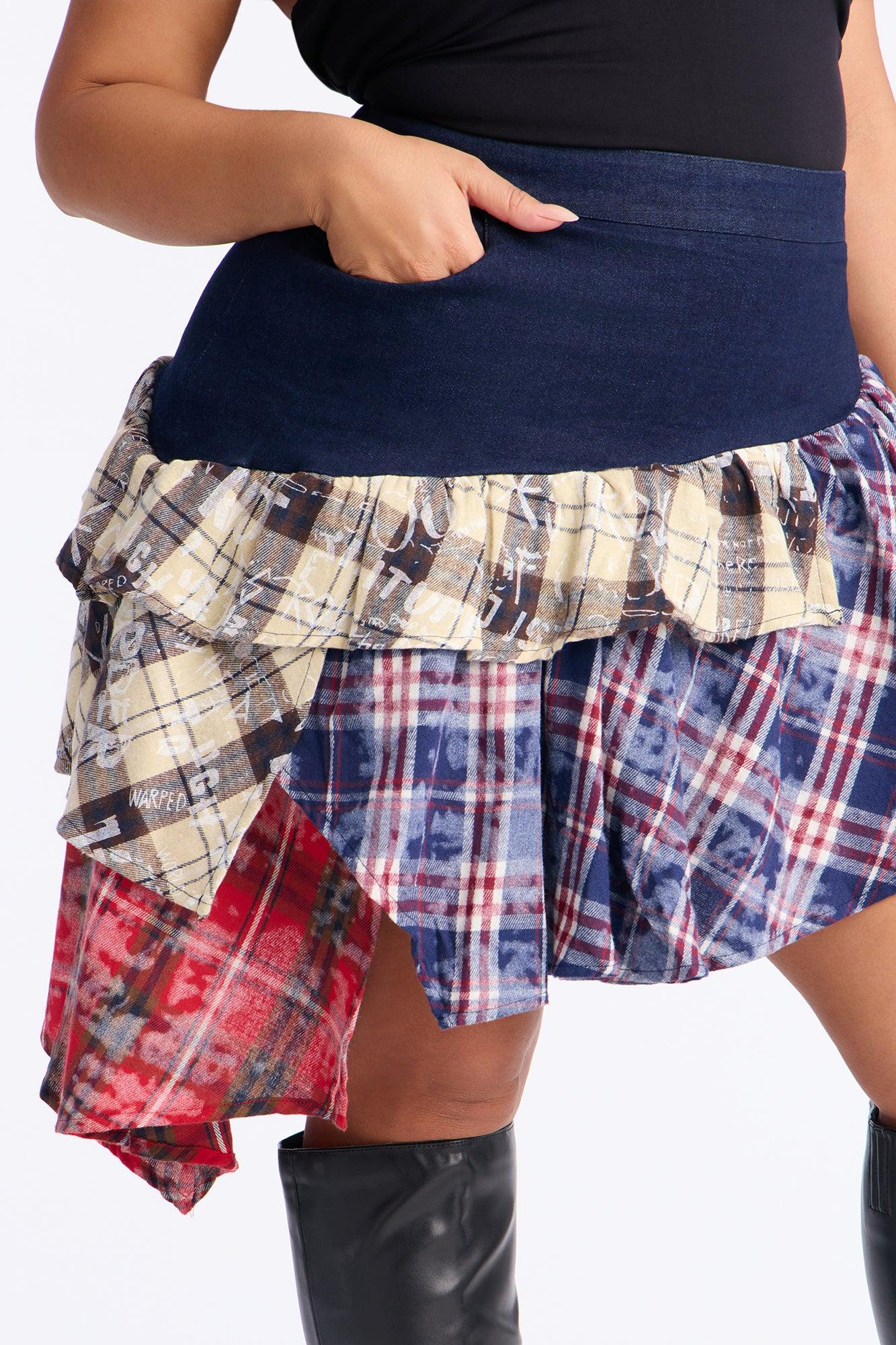 Available In Multi Color. Midi Skirt High Rise Mixed Media Flannel Tiering Plaid Print Denim 27" Length Disclaimer: Plaid Placement Will Vary. Self: 75% Cotton 23% Polyester 2% Spandex Contrast: 75% Polyester 25% Cotton Lining: 95% Polyester 5% Spandex Imported California Proposition 65WARNING: Cancer and Reproductive Harm - www.P65Warnings.ca.gov.