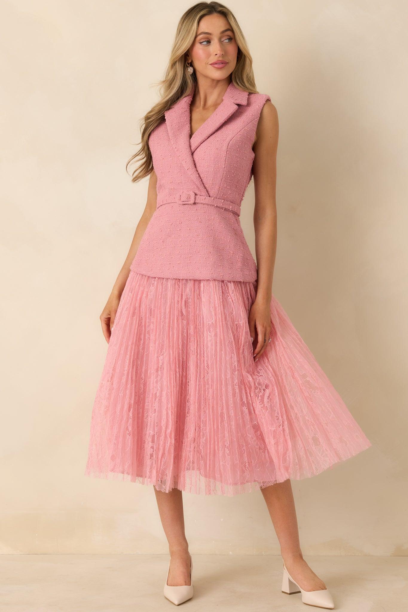 Soft structure meets romantic movement in this thoughtfully designed midi. The tailored, tweed-inspired bodice brings a refined feel, while the airy pleated lace skirt adds lightness and flow with every step. Finished with a slim matching belt, this dress feels polished, feminine, and effortlessly special for spring occasions and beyond. This rose pink midi dress features a sleeveless bodice crafted from a textured woven, tweed-inspired fabric with a notched collar neckline and wrap-style front. A removable matching belt defines the waist before flowing into a pleated lace midi skirt for added movement and dimension. Designed with a concealed back zipper closure and a softly structured silhouette.Self: 70% Polyester & 30% WoolLining 1: 100% PolyesterLining 2: 97% Polyester & 3% SpandexContrast: 100% PolyesterHand Wash ColdManufactured in ChinaDesigned in the USAModel is 5'8" and wearing size small, clipped, model is a true x-small