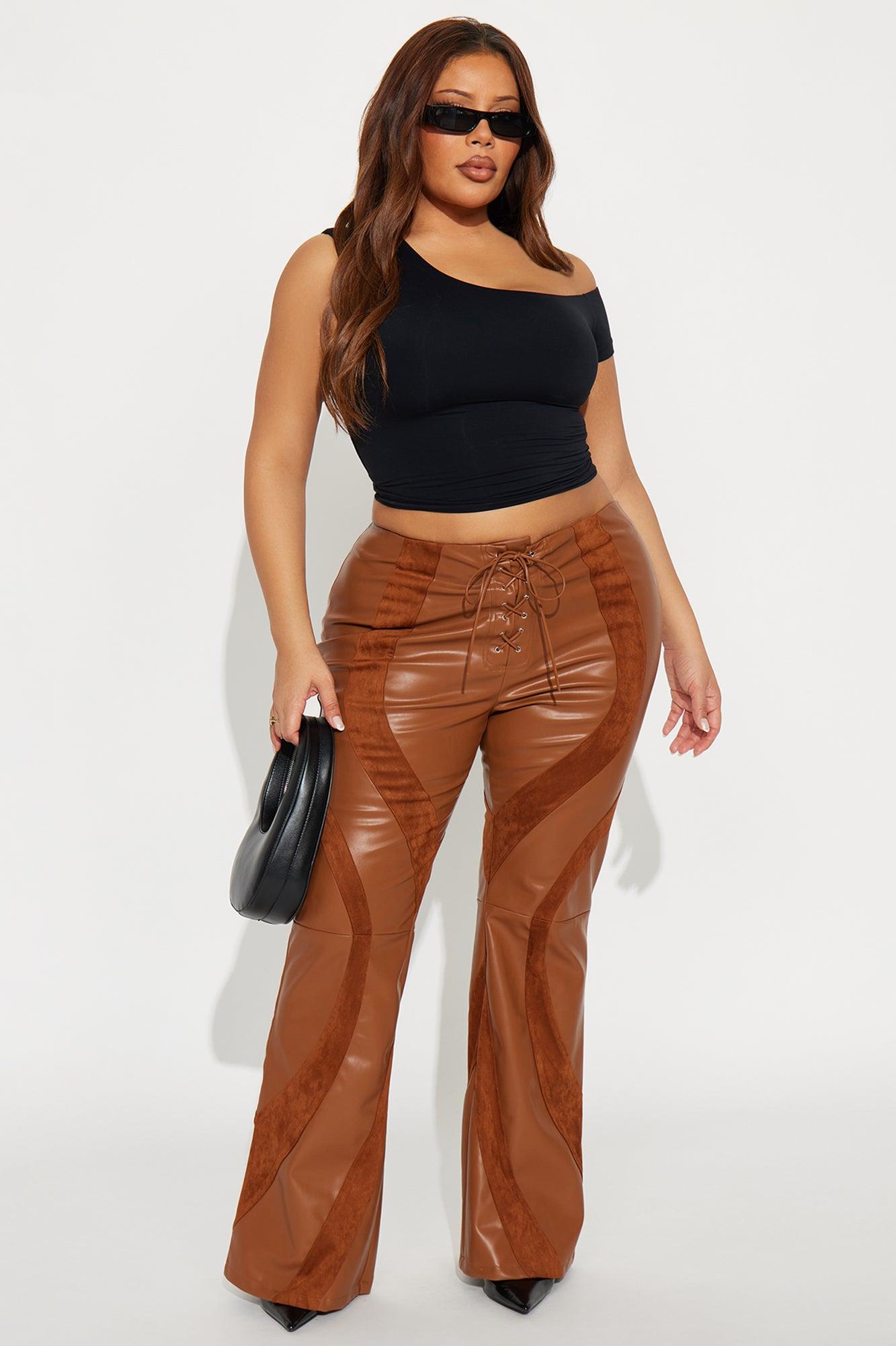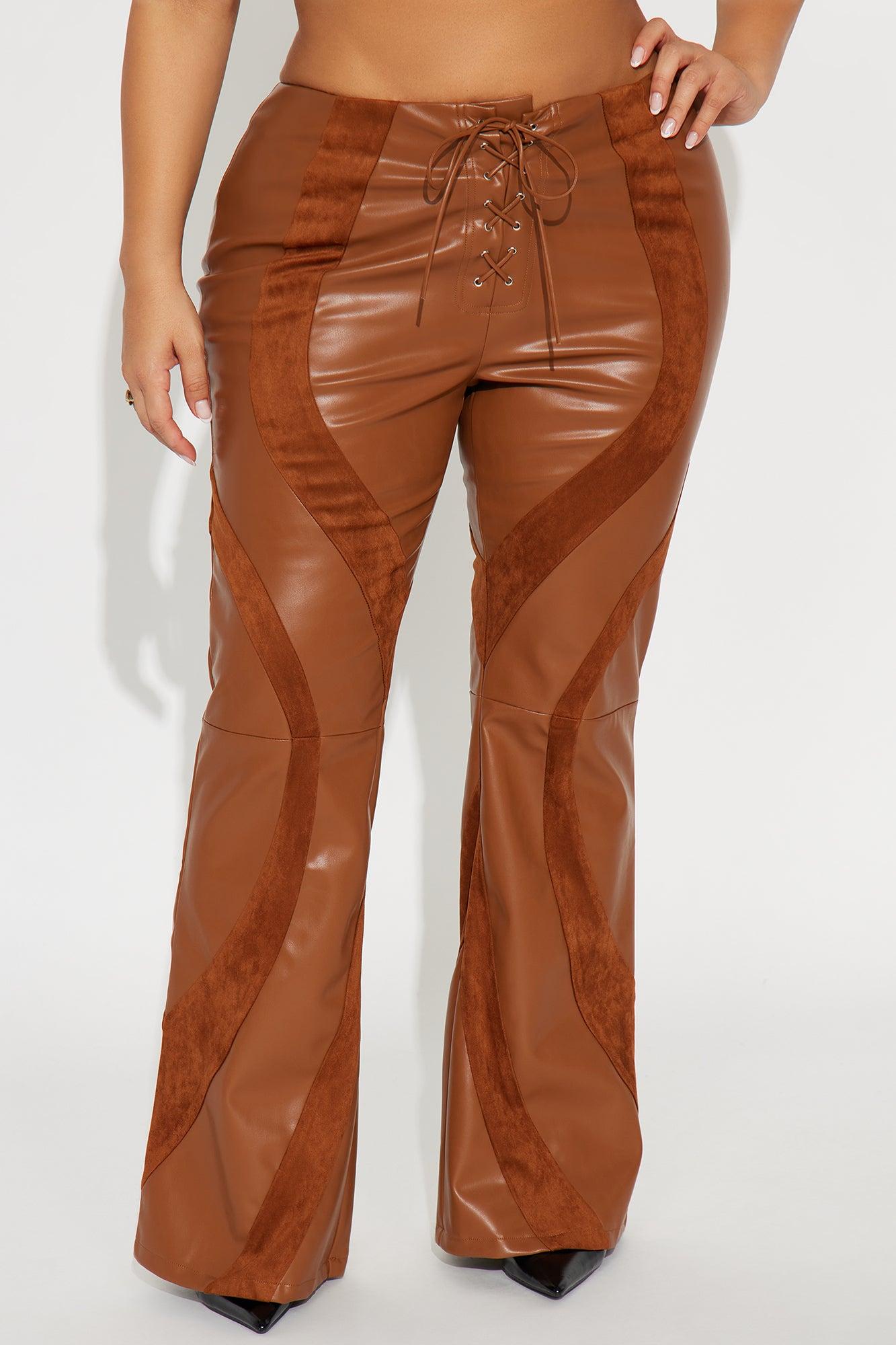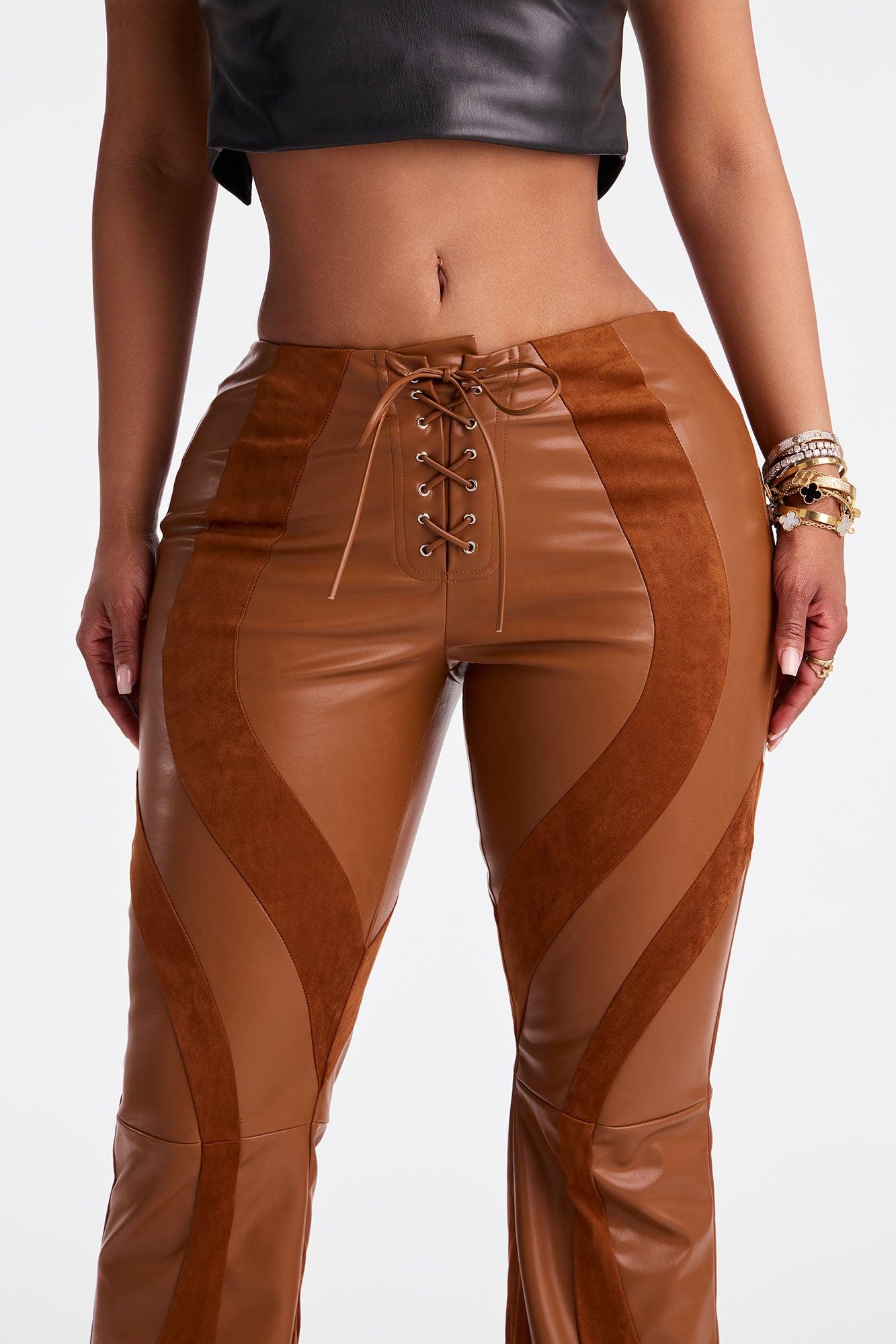 Available In Brown. Flare Pant Elastic Waist Low Rise Faux Leather Lace Up Detail 32" Inseam Stretch Self: 50% Polyurethane 50% Polyester Contrast: 90% Polyester 10% Spandex Imported California Proposition 65WARNING: Cancer and Reproductive Harm - www.P65Warnings.ca.gov.