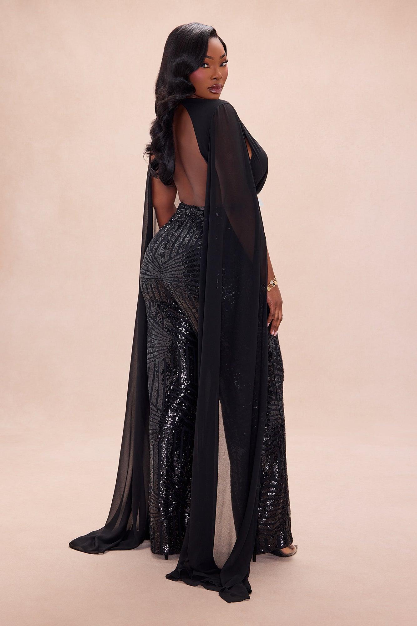 Available In Black. Sequin Jumpsuit Sleeveless Draped Deep V- Neckline Pleated Backless Hidden Back Zipper Closure Lined Stretch Shell: 100% polyester Contrast: 100% Polyester Lining1: 95% Polyester 5% Spandex Lining2: 100% Polyester Imported