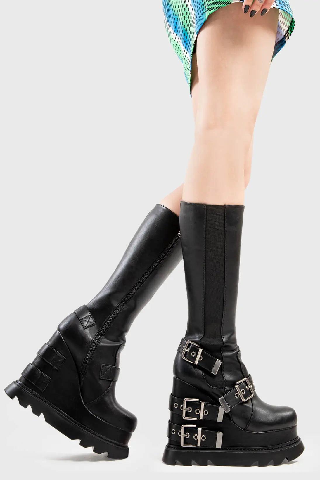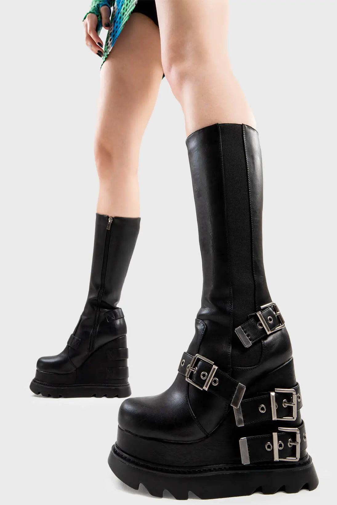 Creating ChaosCausing Riots Chunky Platform Calf Boots in Black faux leather. These Black vegan Wedge boots feature Silver Buckles on the boots and on our Platform wedge sole, perfect for adding height and edge to any look. Made with eco-friendly materials and 100% cruelty-free, these boots are as ethical as they are badass!- Platform Height: - Heel Height- Silver Buckles- Black Zip- Gusset- Wedge sole- Round Toe- 100% vegan SKU: LMF 2944 - BlackPU