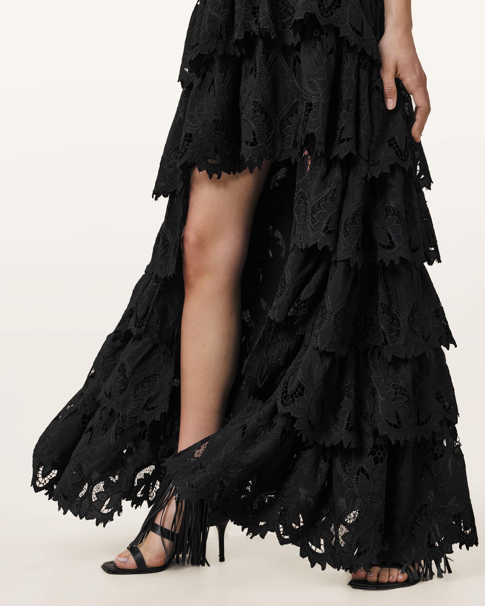 This skirt is designed to a regular fit. Zip closure Maxi length Mid-rise Asymmetric hem Embroidered fabric