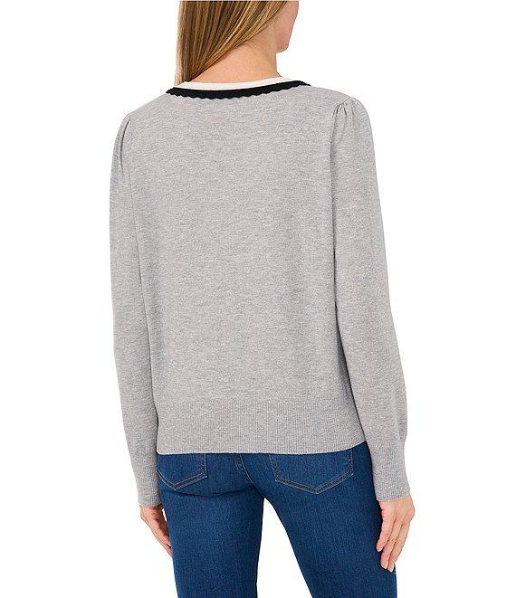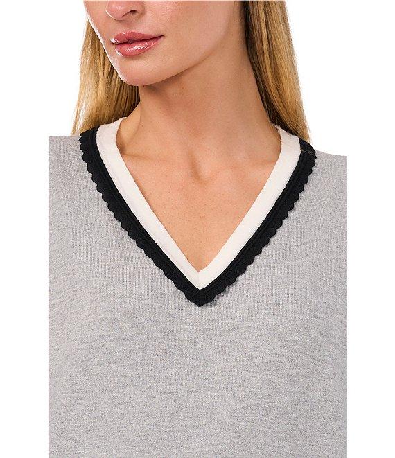 From CeCe, this sweater features: Knit Milano fabrication Sweater silhouette Contrast trim detail Deep v-neckline Long sleeves Double front welt Pullover construction Straight hemline Average length Approx. 22.5" HPS in length Polyester, nylon Machine wash on cold cycle, wash with similar fabrications and colors, promptly remove from wash, lay flat to dry and reshape. Imported.