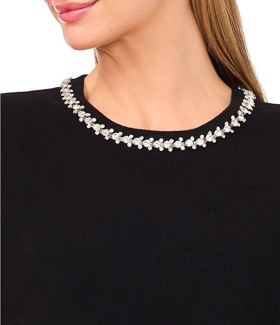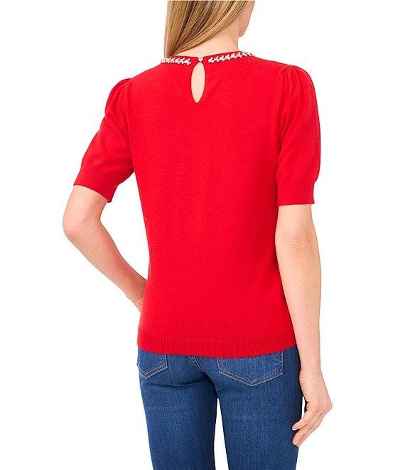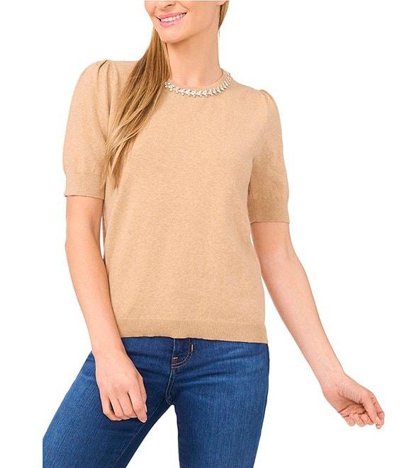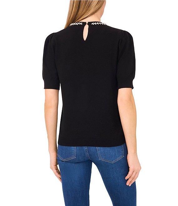 CeCe Knit Round Neck Short Sleeve Embellished Top