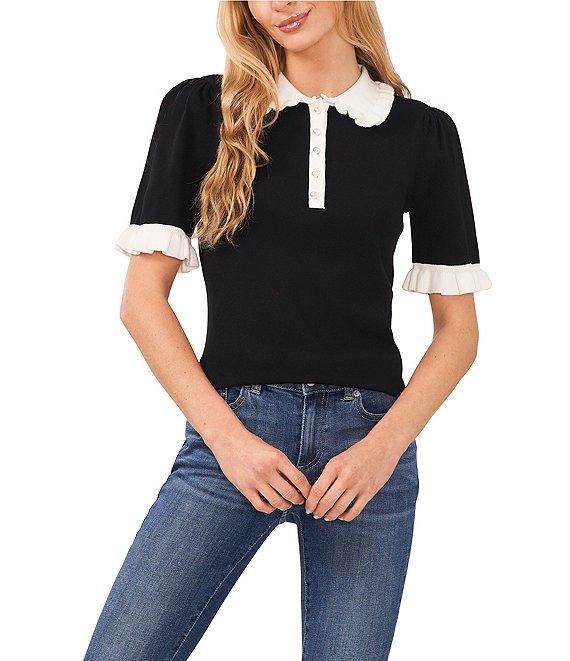 CeCe Knit Ruffle Collar Short Sleeve Partial Button Front Blouse