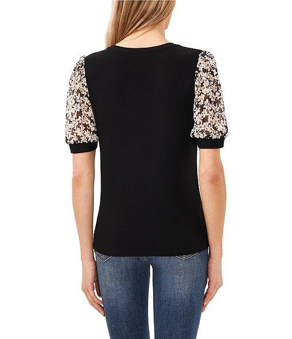 CeCe Mixed Media Floral Print Round Neck Short Puff Sleeve Tee