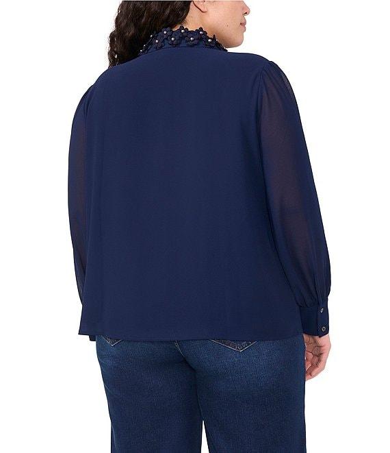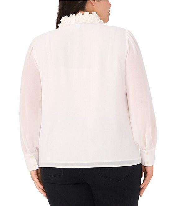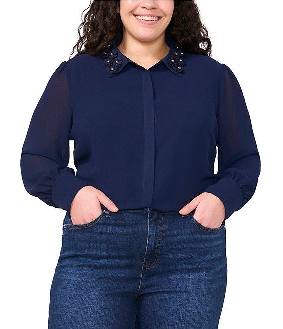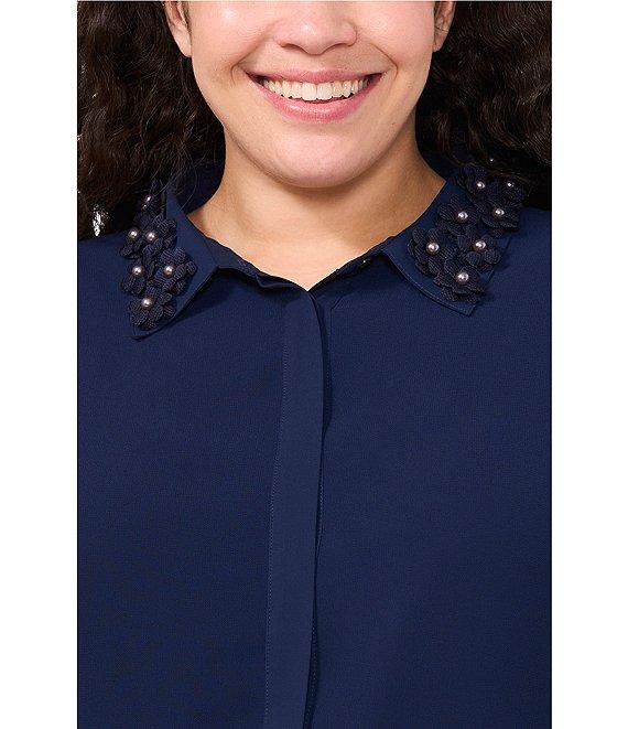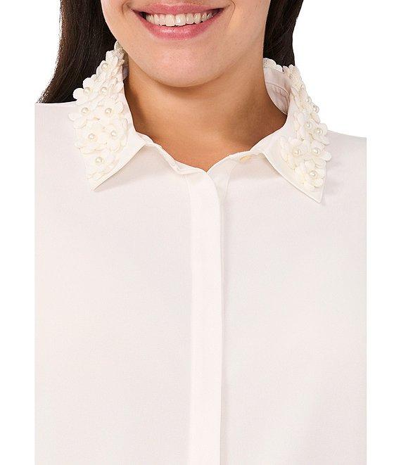 From CeCe Plus, this blouse features: Textured georgette fabrication Blouse silhouette Pointed collar Long sleeves Blouson sleeve silhouette Gathered sleeve at cuff 3D floral applique collar detail Fully lined Classic fit Straight hemline Hidden button front Approx. 27" length Polyester Machine wash on cool cycle, secure buttons before wash, promptly remove from wash, tumble dry on low, use low iron if needed. Imported.