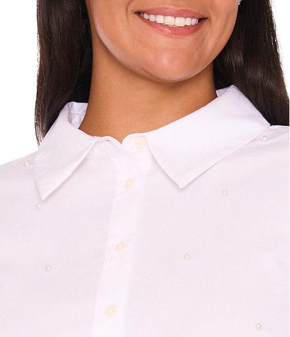 From CeCe Plus, this shirt features: Woven fabrication Point collar neckline Long sleeves Pearl embellished Button front closure Approx. 27.5" in length Cotton Dry clean only Imported.