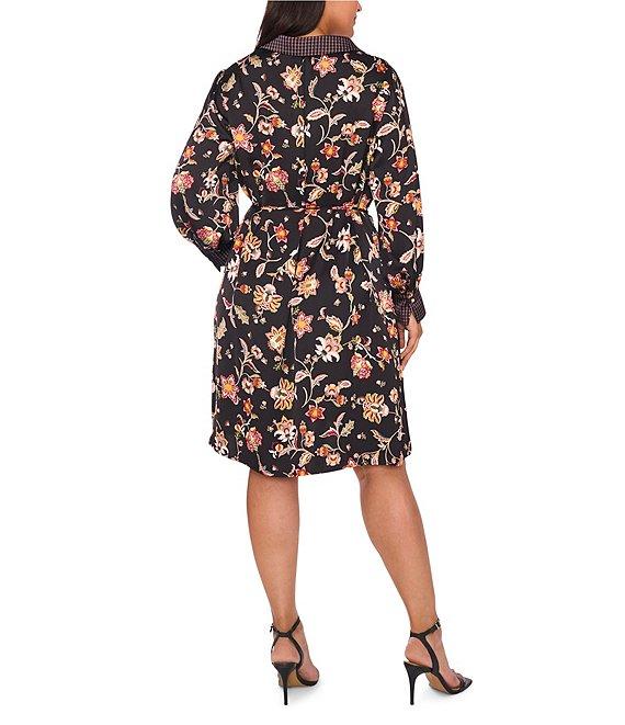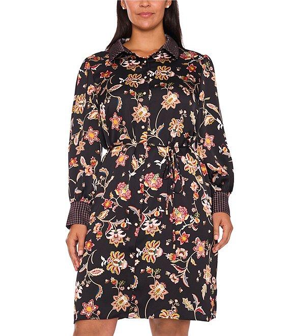 CeCe Plus Size Woven Paisley Print Point Collar Long Sleeve Mini Shirt Dress