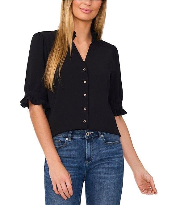 CeCe Ruffle V-Neck Elbow Sleeve Button Down Blouse