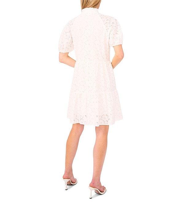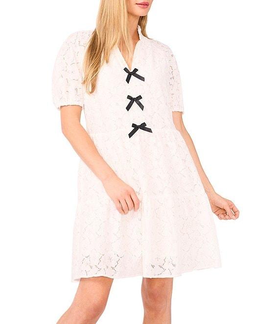 From CeCe, this dress features: Lace fabrication Solid with contrast bows Split round neckline Short puff sleeves Babydoll silhouette Body lined Pullover construction Approx. 35" in length Cotton/spandex Dry clean Imported.