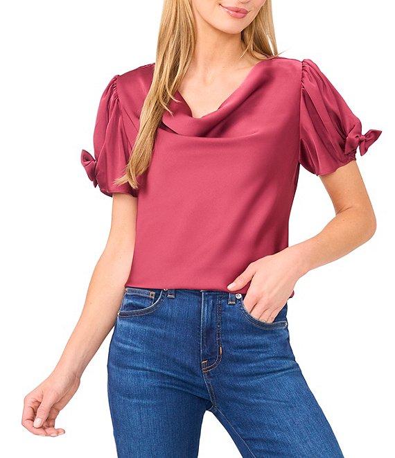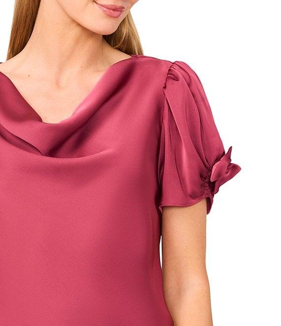 From CeCe, this top features: Woven fabrication Cowl neckline Short sleeve Bow detail on sleeves Straight hemline Pullover construction Approx. 25" in length Polyester Dry clean Imported.